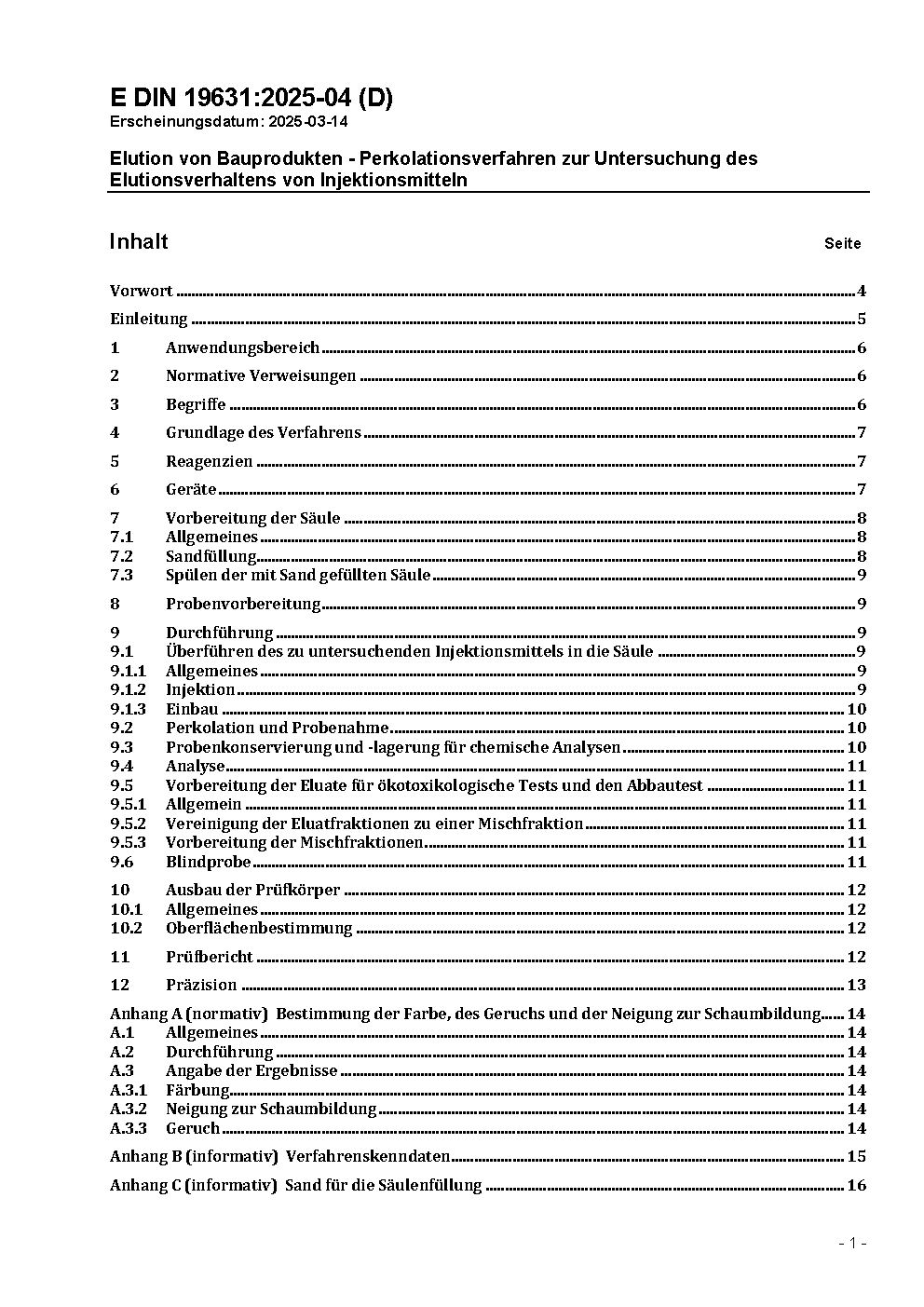 Elution von Bauprodukten - Perkolationsverfahren zur Untersuchung des Elutionsverhaltens von Injektionsmitteln