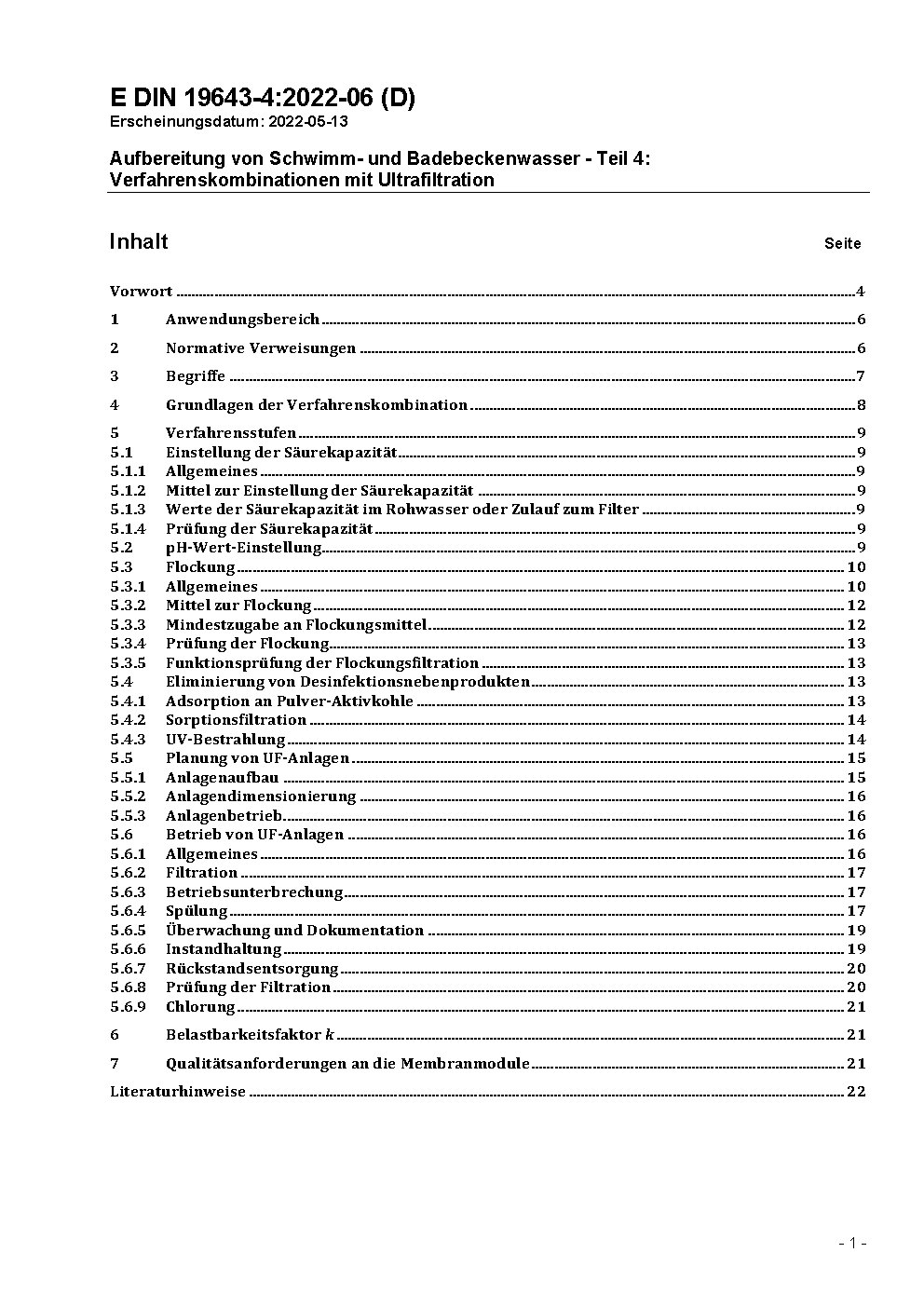 Aufbereitung von Schwimm- und Badebeckenwasser - Teil 4: Verfahrenskombinationen mit Ultrafiltration / Achtung: Diese Norm ist Bestandteil des DVGW Regelwerks.