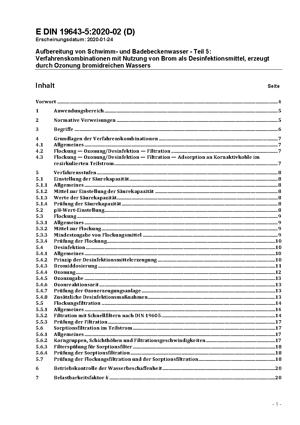 Aufbereitung von Schwimm- und Badebeckenwasser - Teil 5: Verfahrenskombination: Flockung, Filtration, Adsorption an Aktivkornkohle, Chlorung / Achtung: Gilt in Verbindung mit DIN 19643-1 (1997-04)