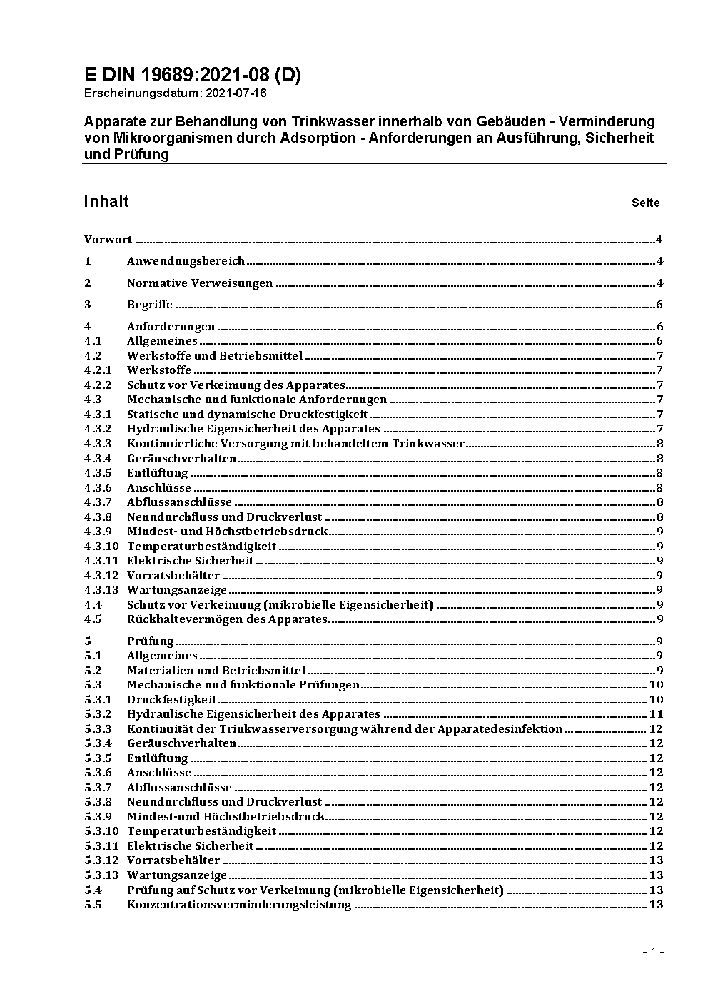 Anlagen zur Behandlung von Trinkwasser innerhalb von Gebäuden - Verminderung von Mikroorganismen durch Adsorption - Anforderungen an Ausführung, Sicherheit und Prüfung