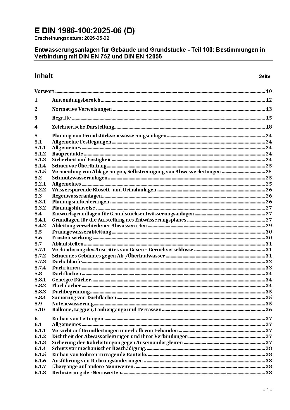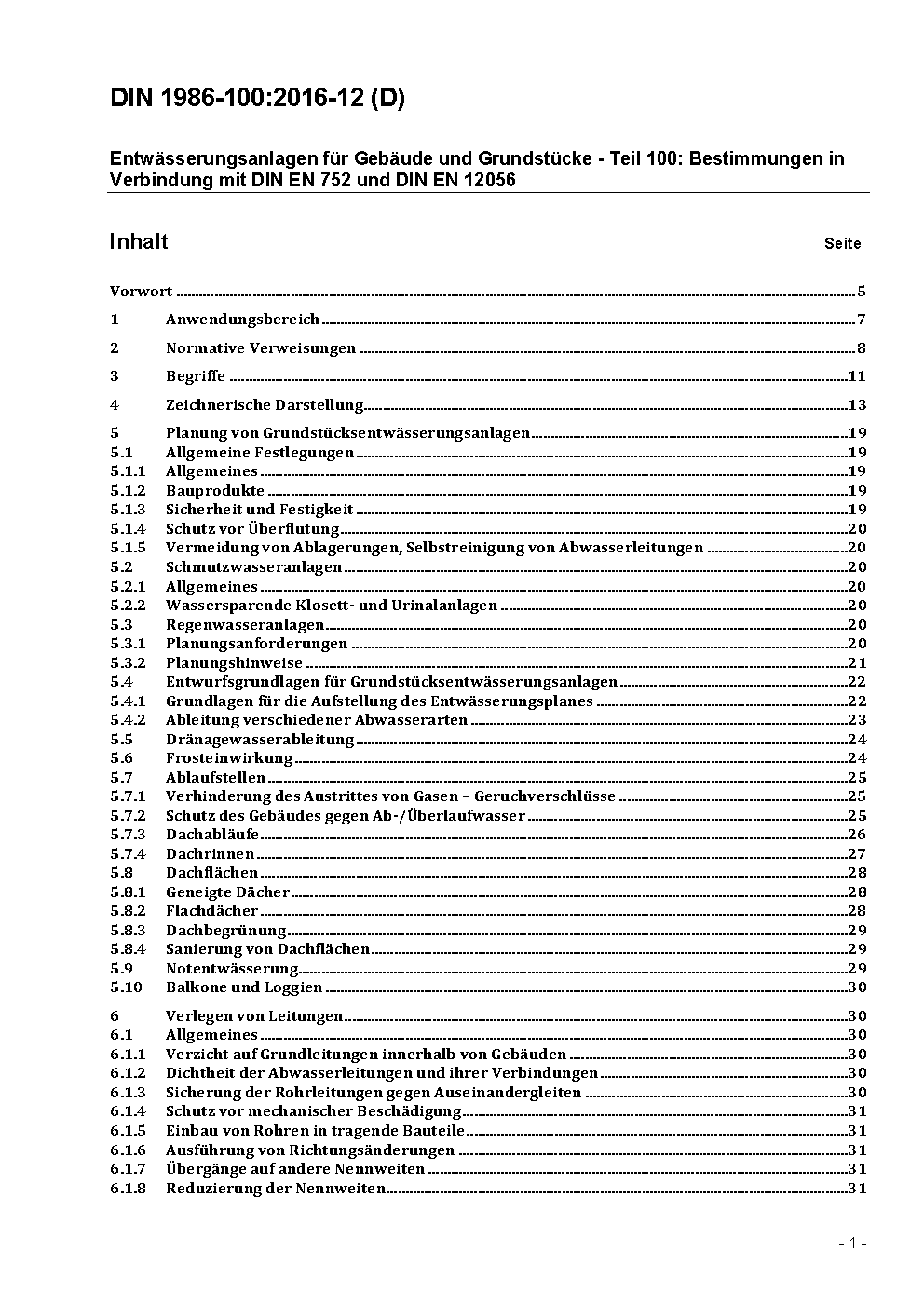 Applies in conjunction with DIN 1986-3 (2004-11), DIN 1986-4 (2003-02), DIN 1986-30 (2003-02), DIN EN 752 (2008-04), DIN EN 1610 (1997-10), DIN EN 12056-1 (2001-01), DIN EN 12056-2 (2001-01), DIN EN 12056-3 (2001-01), DIN EN 12056-4 (2001-01), DIN EN 12056-5 (2001-01)