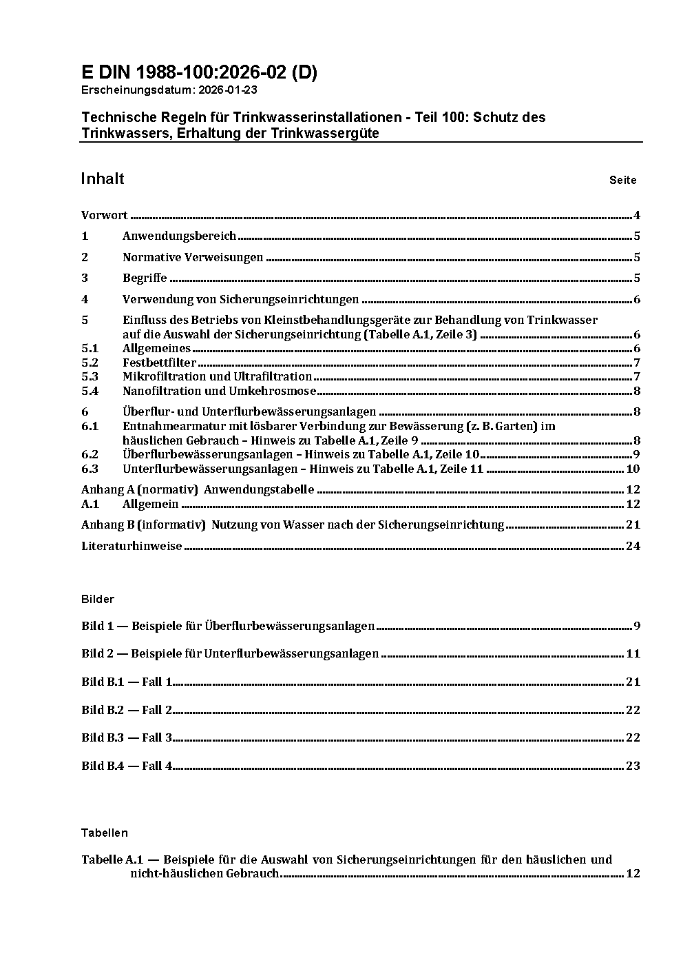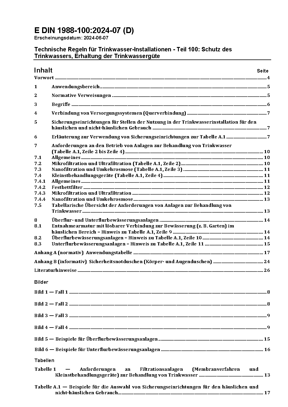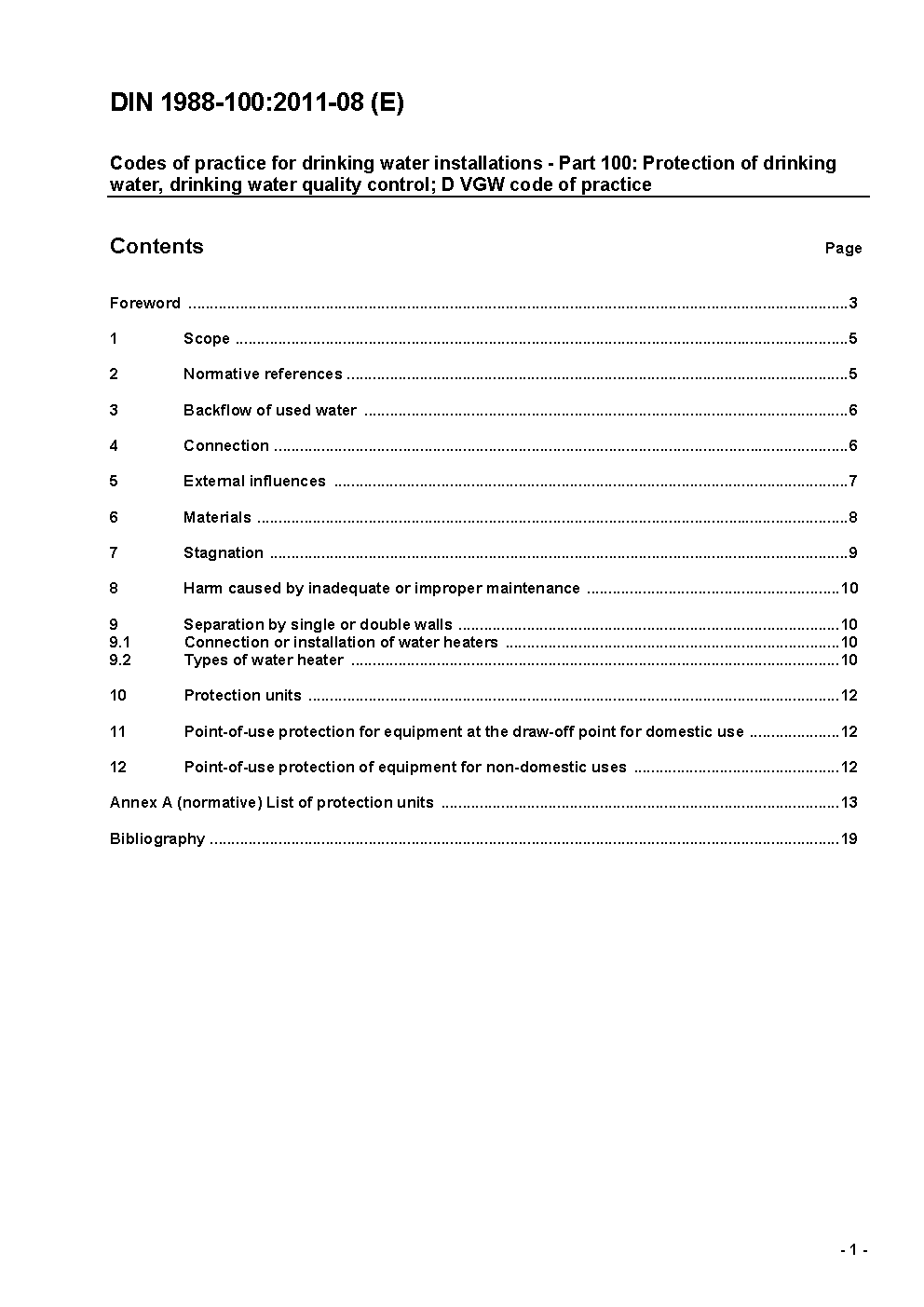Technische Regeln für Trinkwasser-Installationen - Teil 100: Schutz des Trinkwassers, Erhaltung der Trinkwassergüte; Technische Regel des DVGW / Achtung: Gilt in Verbindung mit DIN EN 1717 (2011-08)