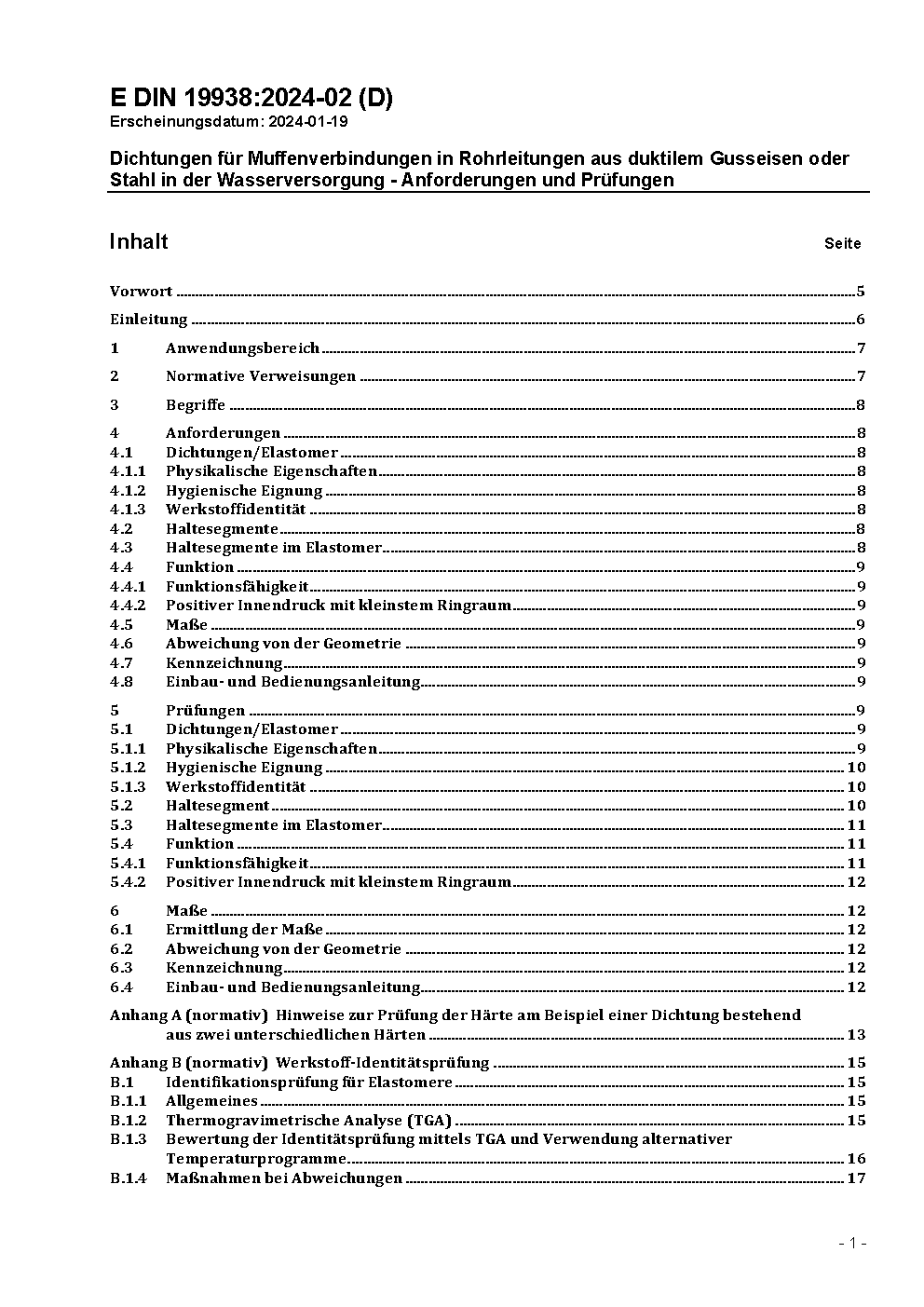 Dichtungen für Muffenverbindungen in Rohrleitungen aus duktilem Gusseisen oder Stahl in der Wasserversorgung - Anforderungen und Prüfungen