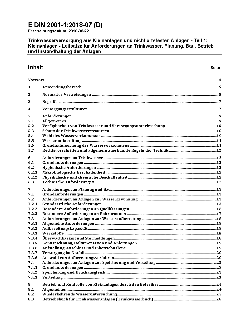 Trinkwasserversorgung aus Kleinanlagen und nicht ortsfesten Anlagen - Teil 1: Kleinanlagen - Leitsätze für Anforderungen an Trinkwasser, Planung, Bau, Betrieb und Instandhaltung der Anlagen; Technische Regel des DVGW