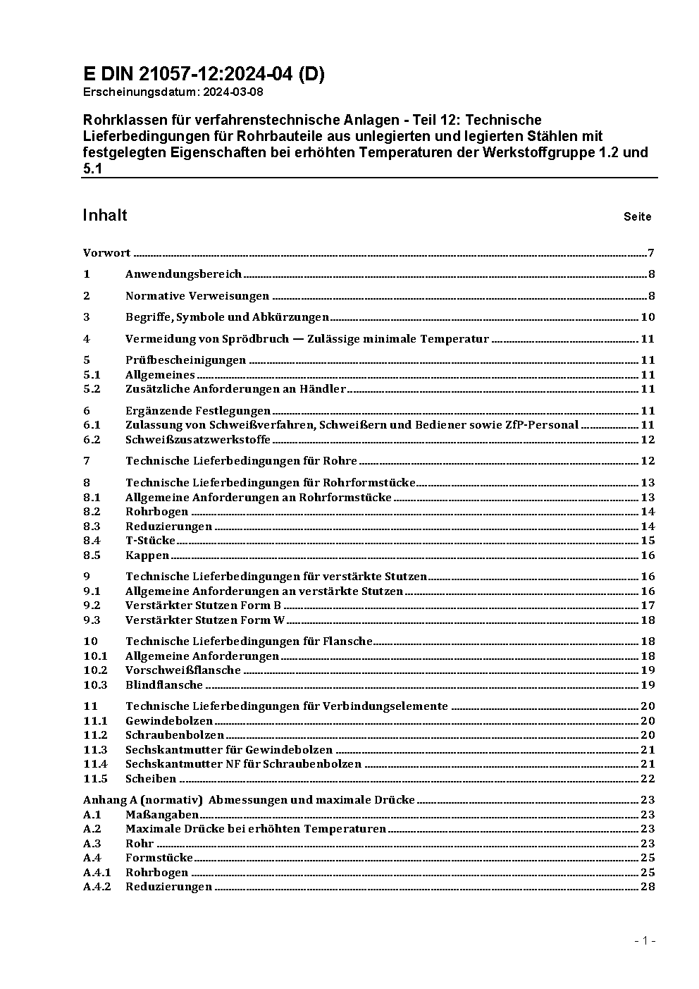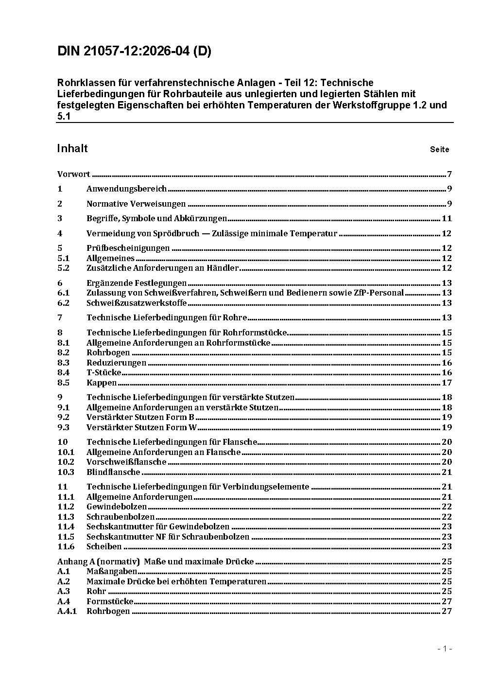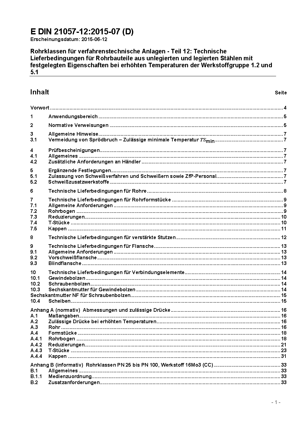 Rohrklassen für verfahrenstechnische Anlagen - Teil 12: Technische Lieferbedingungen für Rohrbauteile aus unlegierten und legierten Stählen mit festgelegten Eigenschaften bei erhöhten Temperaturen der Werkstoffgruppe 1.2 und 5.1