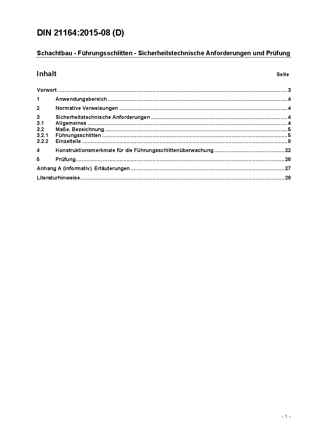 Schachtbau - Führungsschlitten - Sicherheitstechnische Anforderungen und Prüfung / Achtung: Übergangsfrist, festgelegt durch DIN 21164 (2015-08), bis 2016-01-31 beachten.