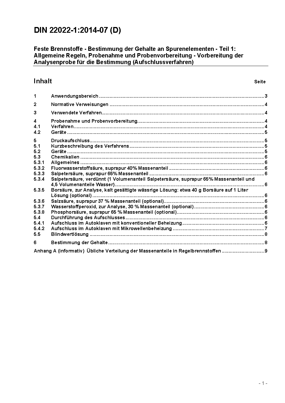 Feste Brennstoffe - Bestimmung der Gehalte an Spurenelementen - Teil 1: Allgemeine Regeln, Probenahme und Probenvorbereitung - Vorbereitung der Analysenprobe für die Bestimmung (Aufschlussverfahren)