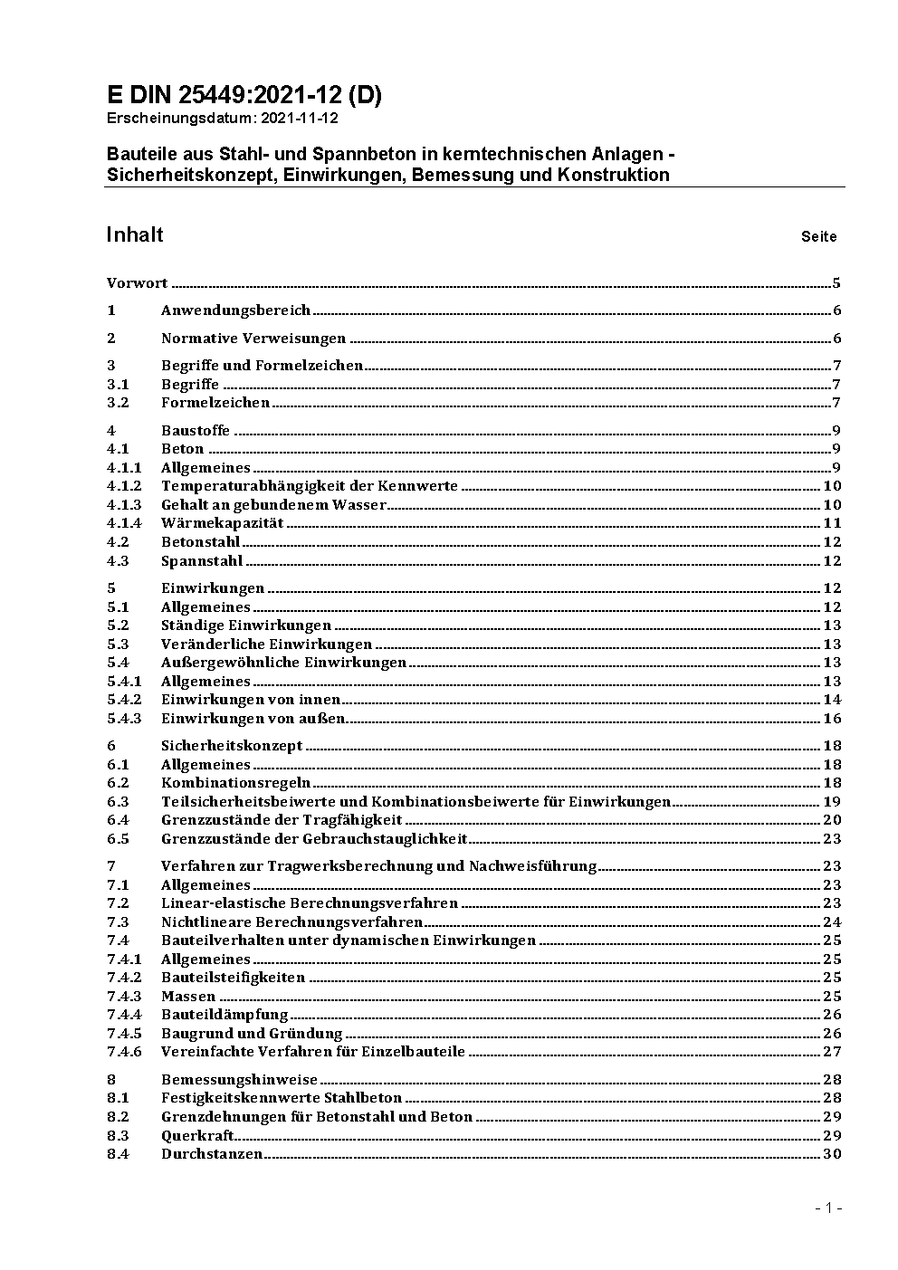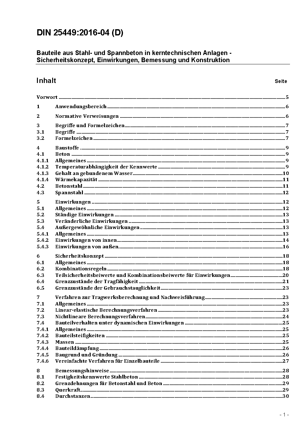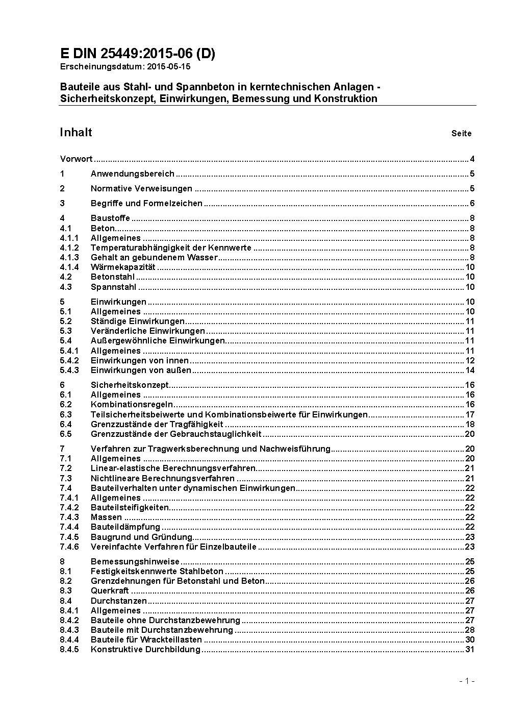 Bauteile aus Stahl- und Spannbeton in kerntechnischen Anlagen - Sicherheitskonzept, Einwirkungen, Bemessung und Konstruktion / Achtung: Übergangsfrist, festgelegt durch DIN 25449 (2016-04), bis 2016-10-01 beachten.