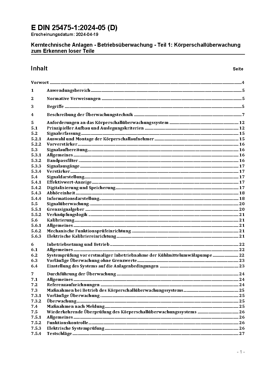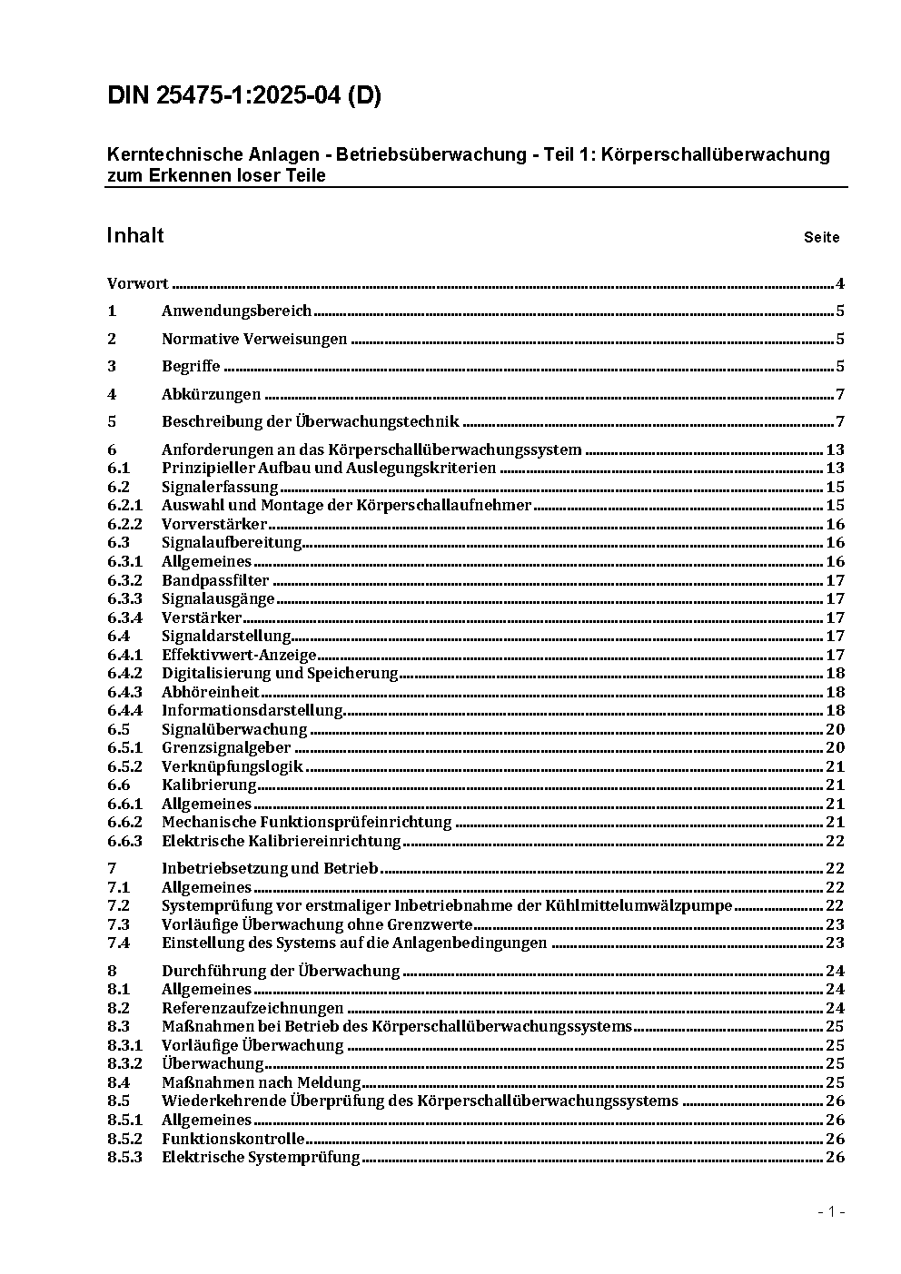 Kerntechnische Anlagen - Betriebsüberwachung - Teil 1: Körperschallüberwachung zum Erkennen loser Teile