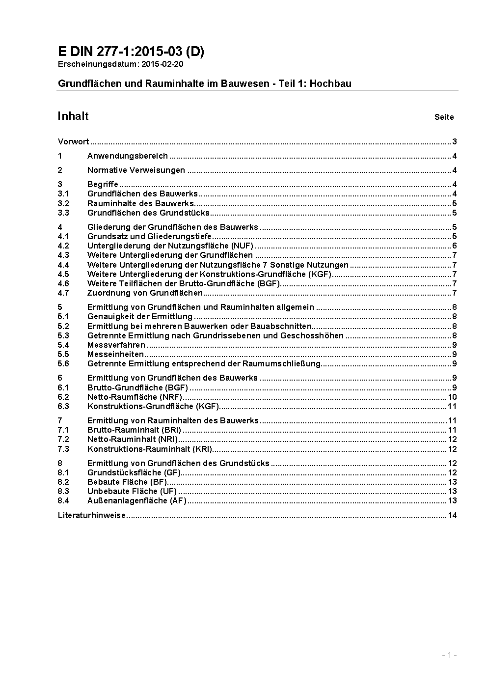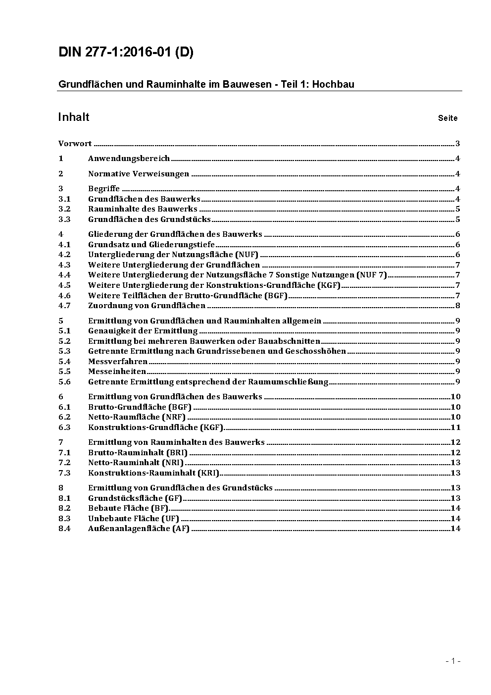 Grundflächen und Rauminhalte von Bauwerken im Hochbau - Teil 1: Begriffe, Ermittlungsgrundlagen
