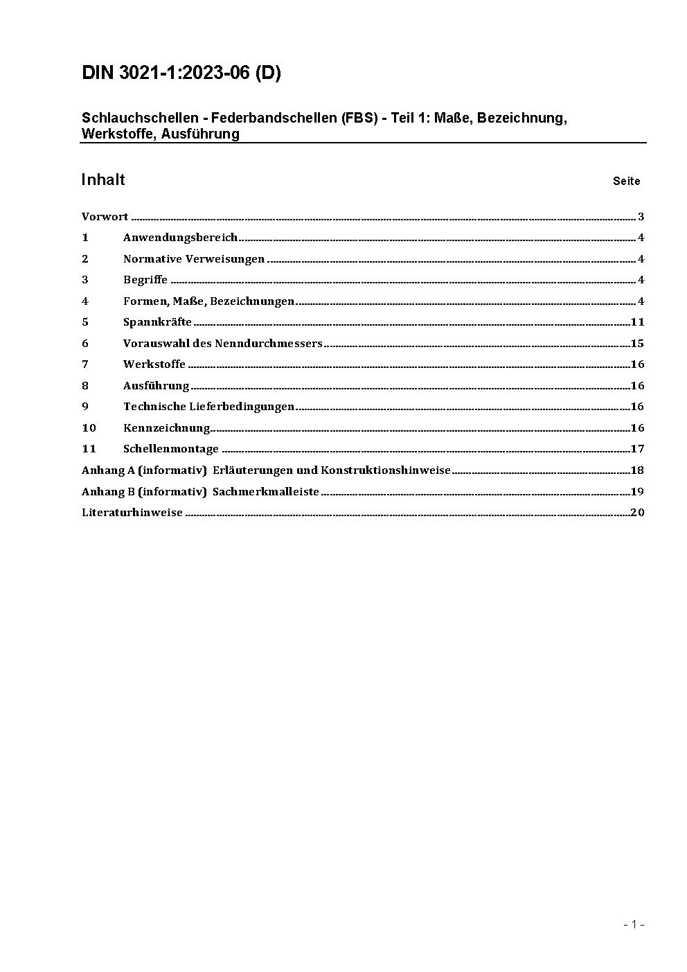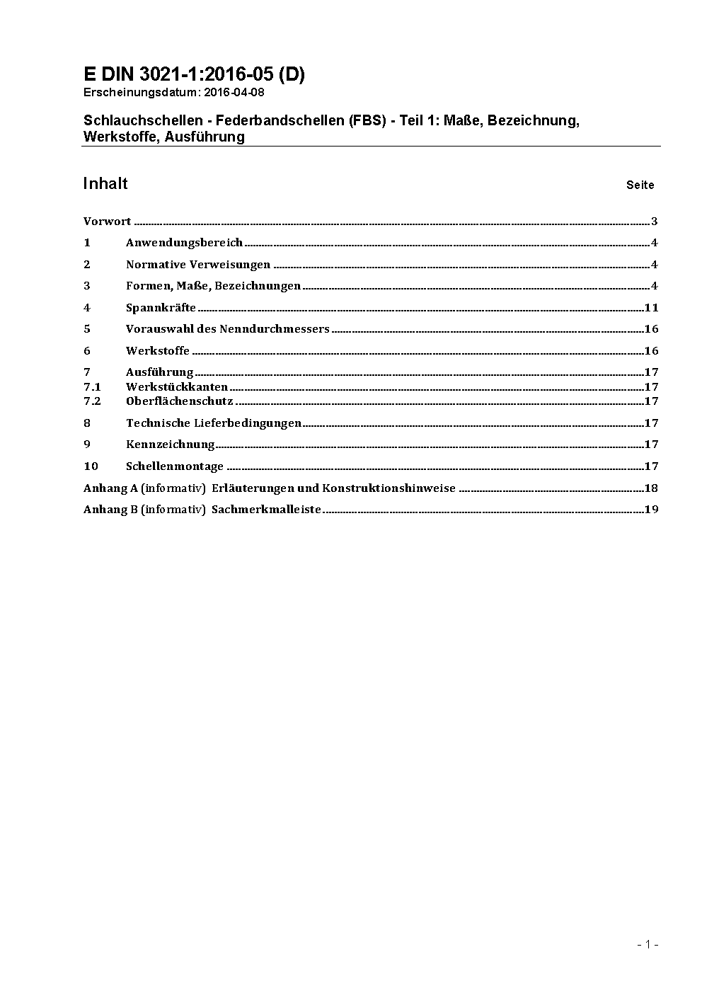 Schlauchschellen - Federbandschellen (FBS) - Teil 1: Maße, Bezeichnung, Werkstoffe, Ausführung