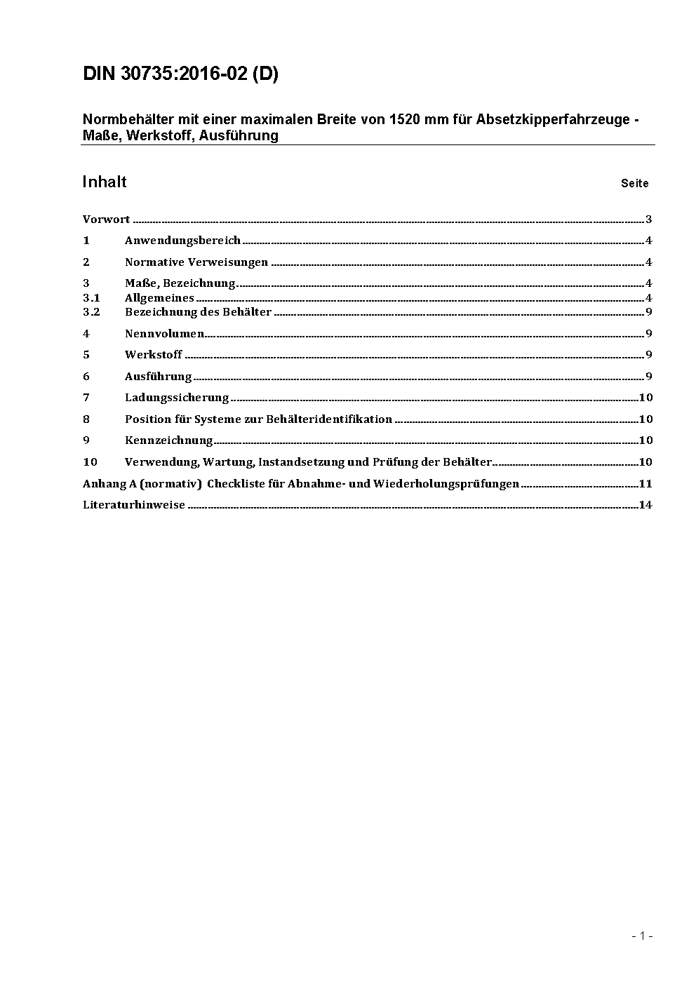 Normbehälter mit einer maximalen Breite von 1520 mm für Absetzkipperfahrzeuge - Maße, Werkstoff, Ausführung