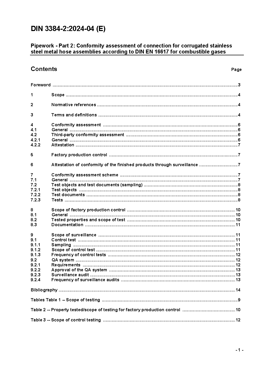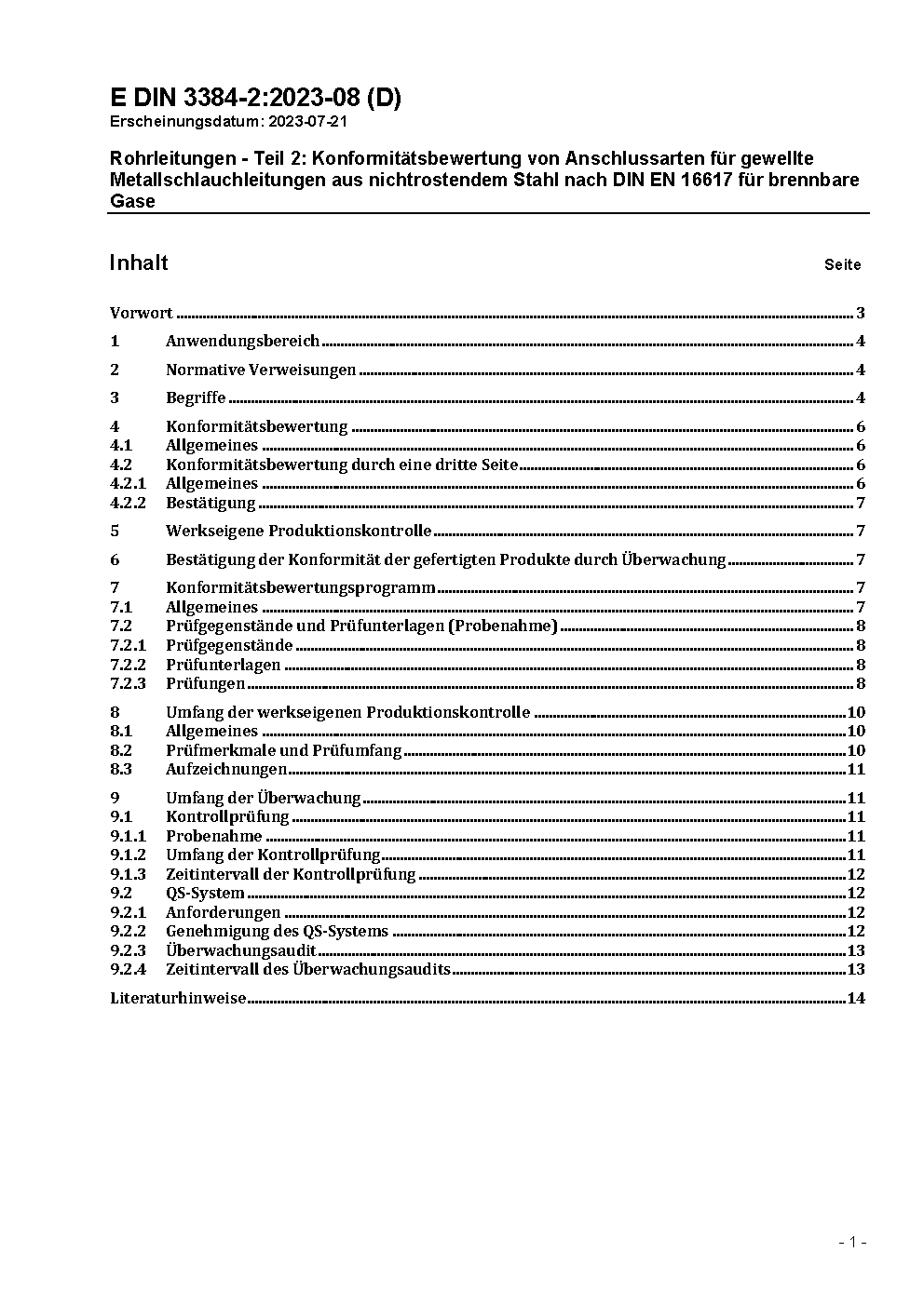 Rohrleitungen - Teil 2: Konformitätsbewertung von Anschlussarten für gewellte Metallschlauchleitungen aus nichtrostendem Stahl nach DIN EN 16617 für brennbare Gase / Achtung: Gilt in Verbindung mit DIN 3384-1 (2023-08)