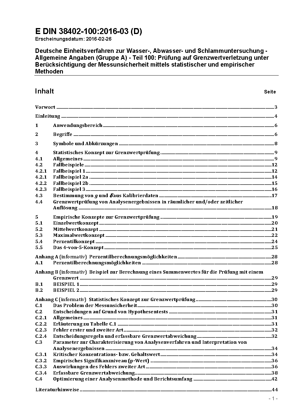 Deutsche Einheitsverfahren zur Wasser-, Abwasser- und Schlammuntersuchung - Allgemeine Angaben (Gruppe A) - Teil 100: Prüfung auf Grenzwertverletzung unter Berücksichtigung der Messunsicherheit mittels statistischer und empirischer Methoden