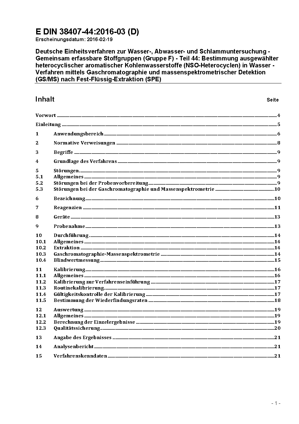Deutsche Einheitsverfahren zur Wasser-, Abwasser- und Schlammuntersuchung - Gemeinsam erfassbare Stoffgruppen (Gruppe F) - Teil 44: Bestimmung ausgewählter heterocyclischer aromatischer Kohlenwasserstoffe (NSO-Heterocyclen) in Wasser - Verfahren mittels Gaschromatographie und massenspektrometrischer Detektion (GS/MS) nach Fest-Flüssig-Extraktion (SPE) (F 44)