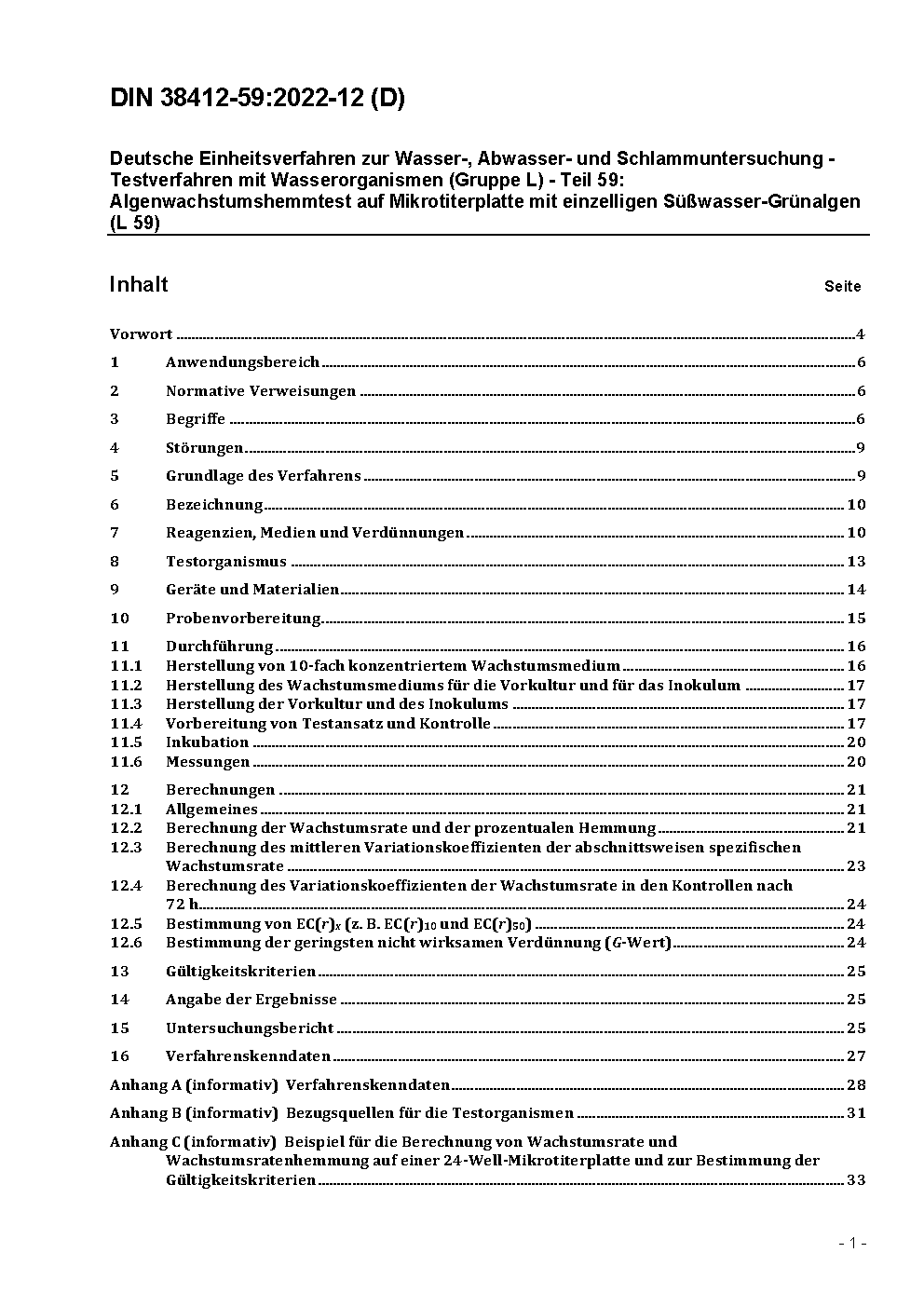 Deutsche Einheitsverfahren zur Wasser-, Abwasser- und Schlammuntersuchung - Testverfahren mit Wasserorganismen (Gruppe L) - Algenwachstumshemmtest auf Mikrotiterplatte mit einzelligen Süßwasser-Grünalgen (L 59)