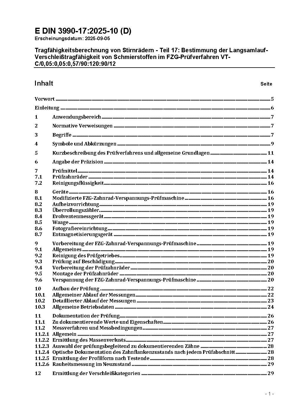 Tragfähigkeitsberechnung von Stirnrädern - Teil 17: Bestimmung der Langsamlauf-Verschleißtragfähigkeit von Schmierstoffen im FZG-Prüfverfahren VT-C/0,05:0,05:0,57/90:120:90/12