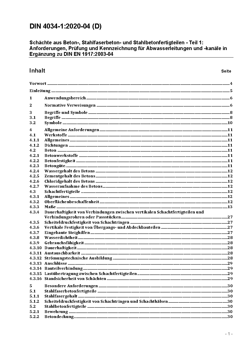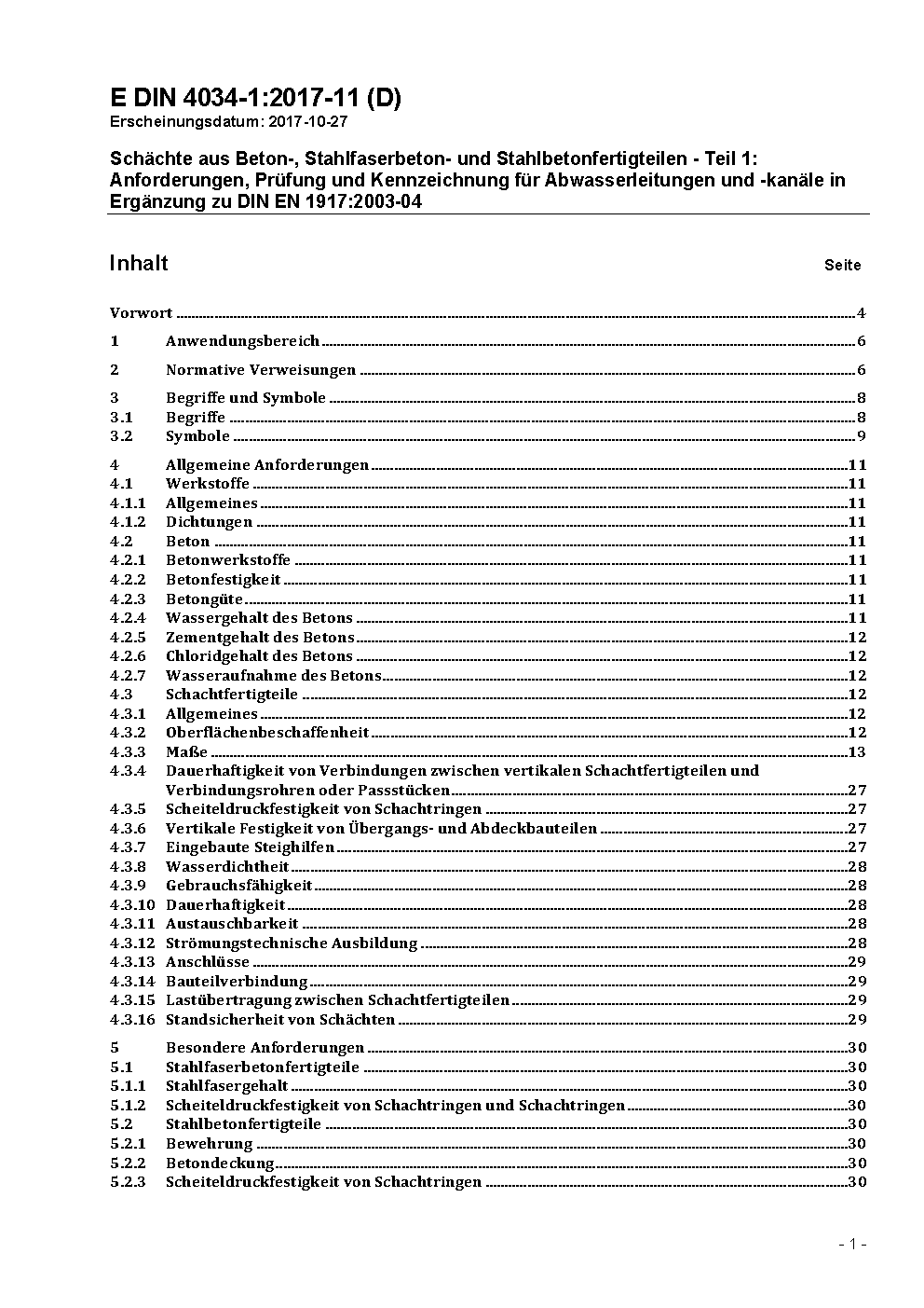 Schächte aus Beton-, Stahlfaserbeton- und Stahlbetonfertigteilen - Teil 1: Anforderungen, Prüfung und Kennzeichnung für Abwasserleitungen und -kanäle in Ergänzung zu DIN EN 1917:2003-04 / Achtung: Gilt in Verbindung mit DIN 4034-101 (2017-11)