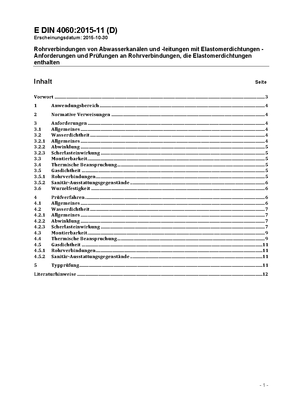 Rohrverbindungen von Abwasserkanälen und -leitungen mit Elastomerdichtungen - Anforderungen und Prüfungen an Rohrverbindungen, die Elastomerdichtungen enthalten / Achtung: Die Ausgabe 1988.12 bleibt zunächst gültig*Gilt in Verbindung mit DIN EN 681-1 (2003-05), DIN EN 681-3 (2003-05)