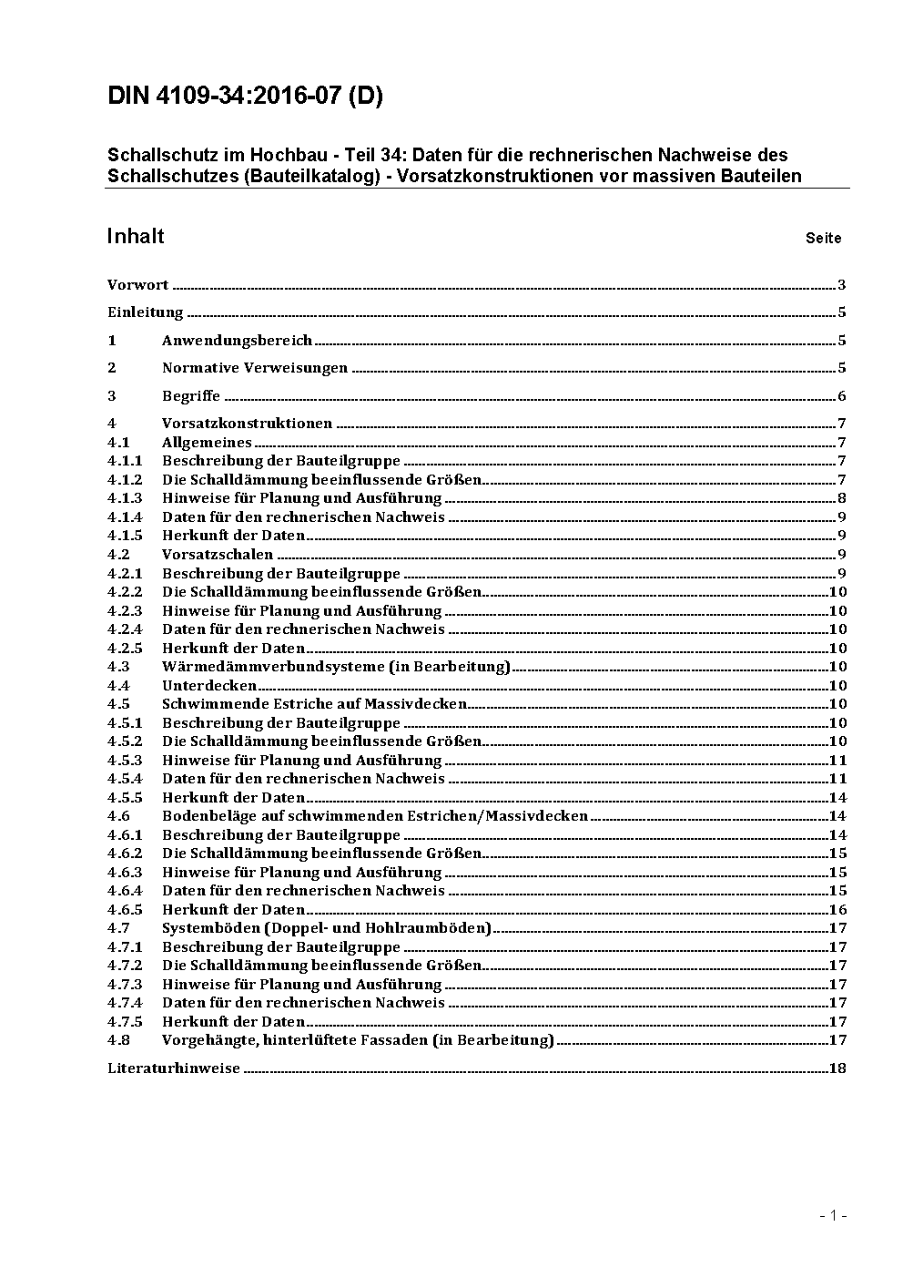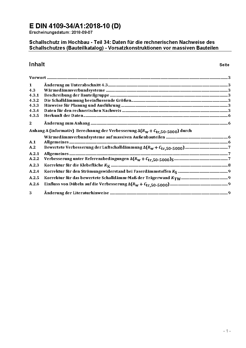 Schallschutz im Hochbau - Teil 34: Daten für die rechnerischen Nachweise des Schallschutzes (Bauteilkatalog) - Vorsatzkonstruktionen vor massiven Bauteilen; Änderung A1