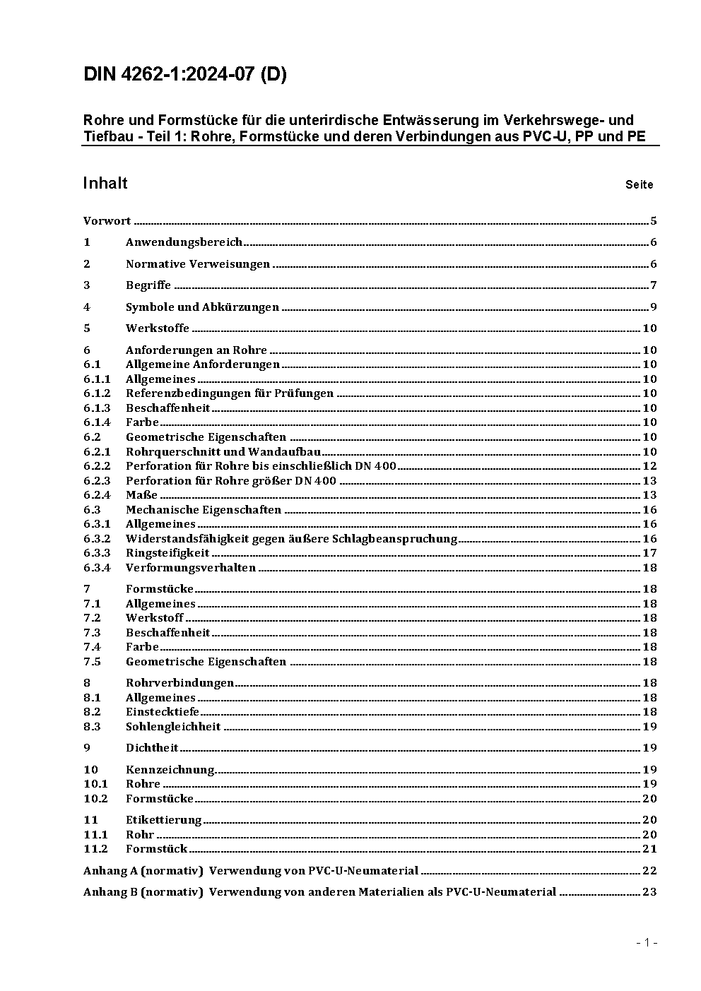 Rohre und Formstücke für die unterirdische Entwässerung im Verkehrswege- und Tiefbau - Teil 1: Rohre, Formstücke und deren Verbindungen aus PVC-U, PP und PE
