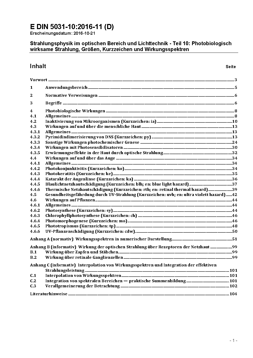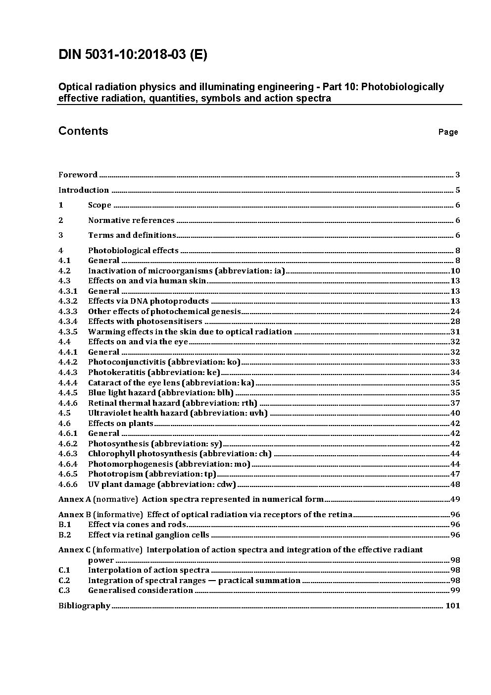 Strahlungsphysik im optischen Bereich und Lichttechnik - Teil 10: Photobiologisch wirksame Strahlung, Größen, Kurzzeichen und Wirkungsspektren