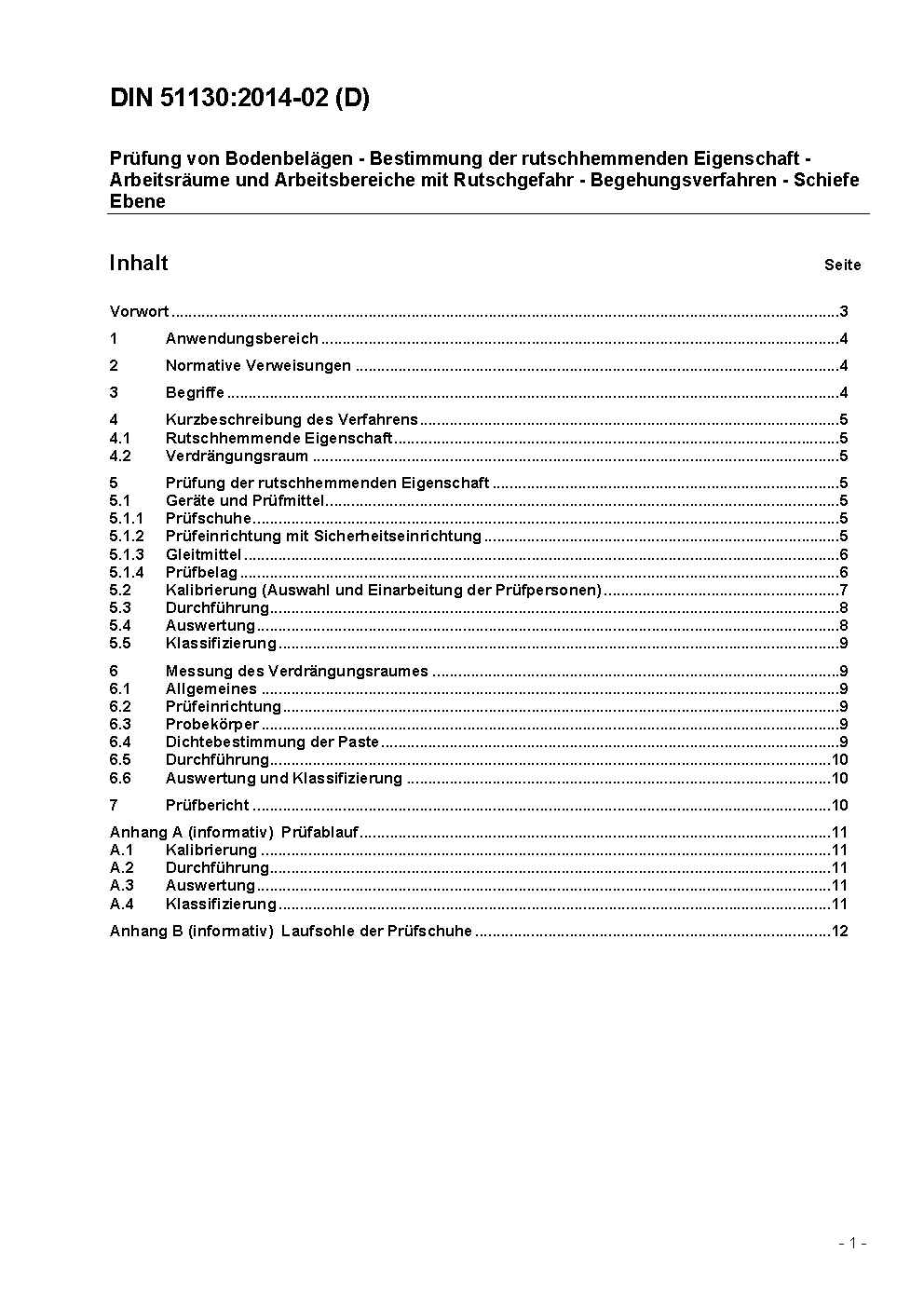 Prüfung von Bodenbelägen - Bestimmung der rutschhemmenden Eigenschaft - Arbeitsräume und Arbeitsbereiche mit Rutschgefahr, Begehungsverfahren - Schiefe Ebene