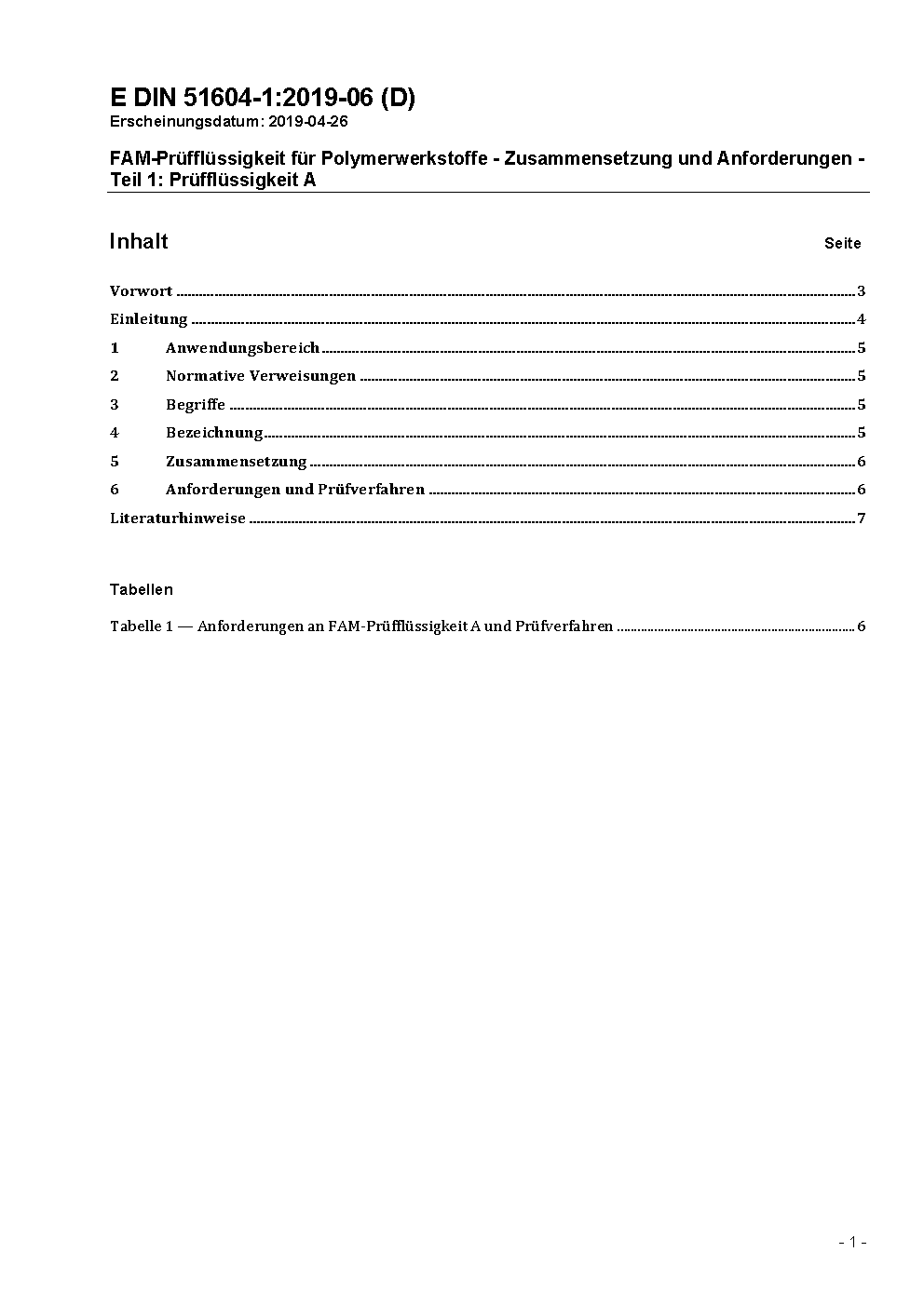 FAM-Prüfflüssigkeit für Polymerwerkstoffe - Zusammensetzung und Anforderungen - Teil 1: Prüfflüssigkeit A