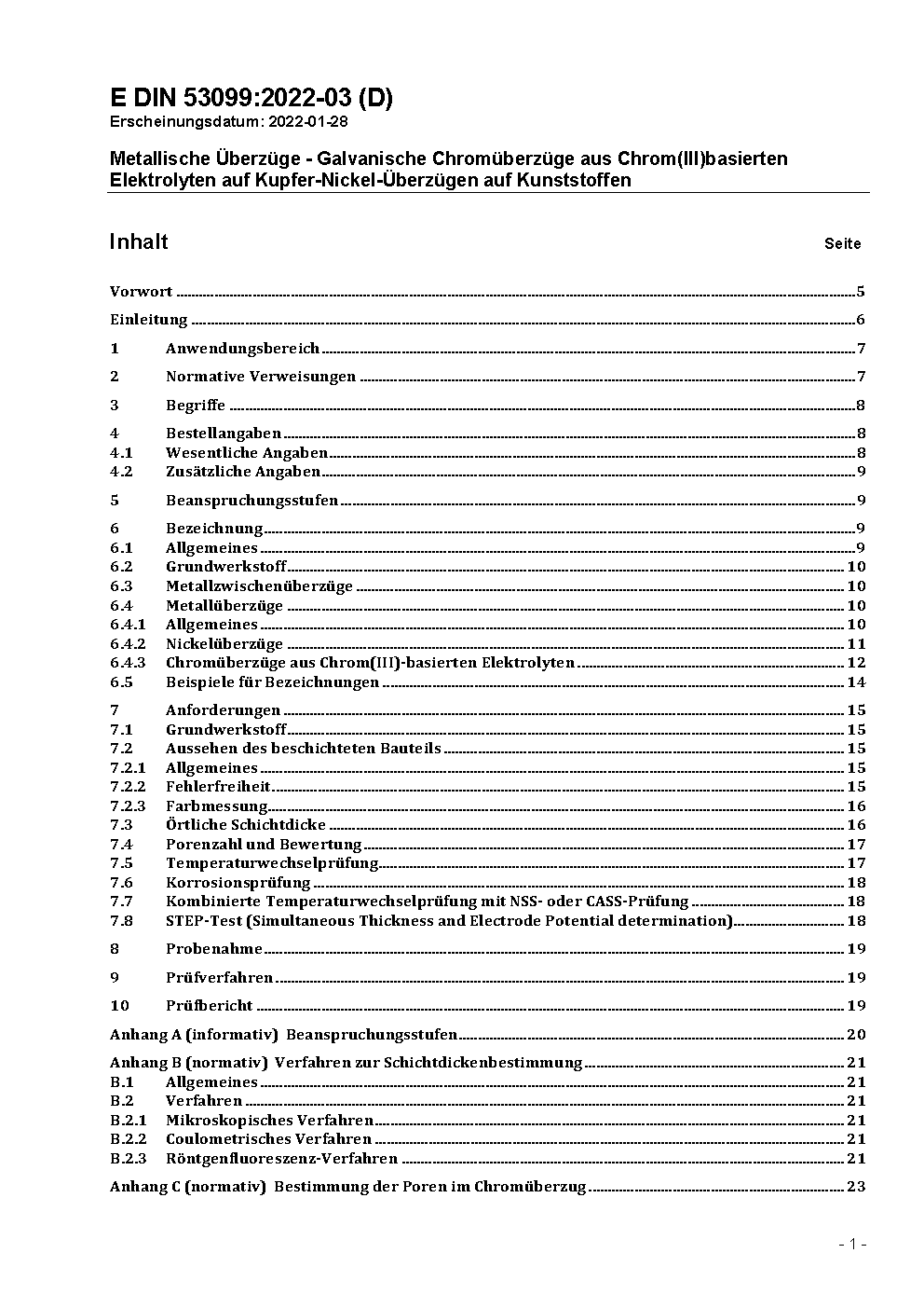 Metallische Überzüge - Galvanische Chromüberzüge aus Chrom(III)-basierten Elektrolyten auf Kupfer-Nickel-Überzügen auf Kunststoffen - Anforderungen und Prüfverfahren