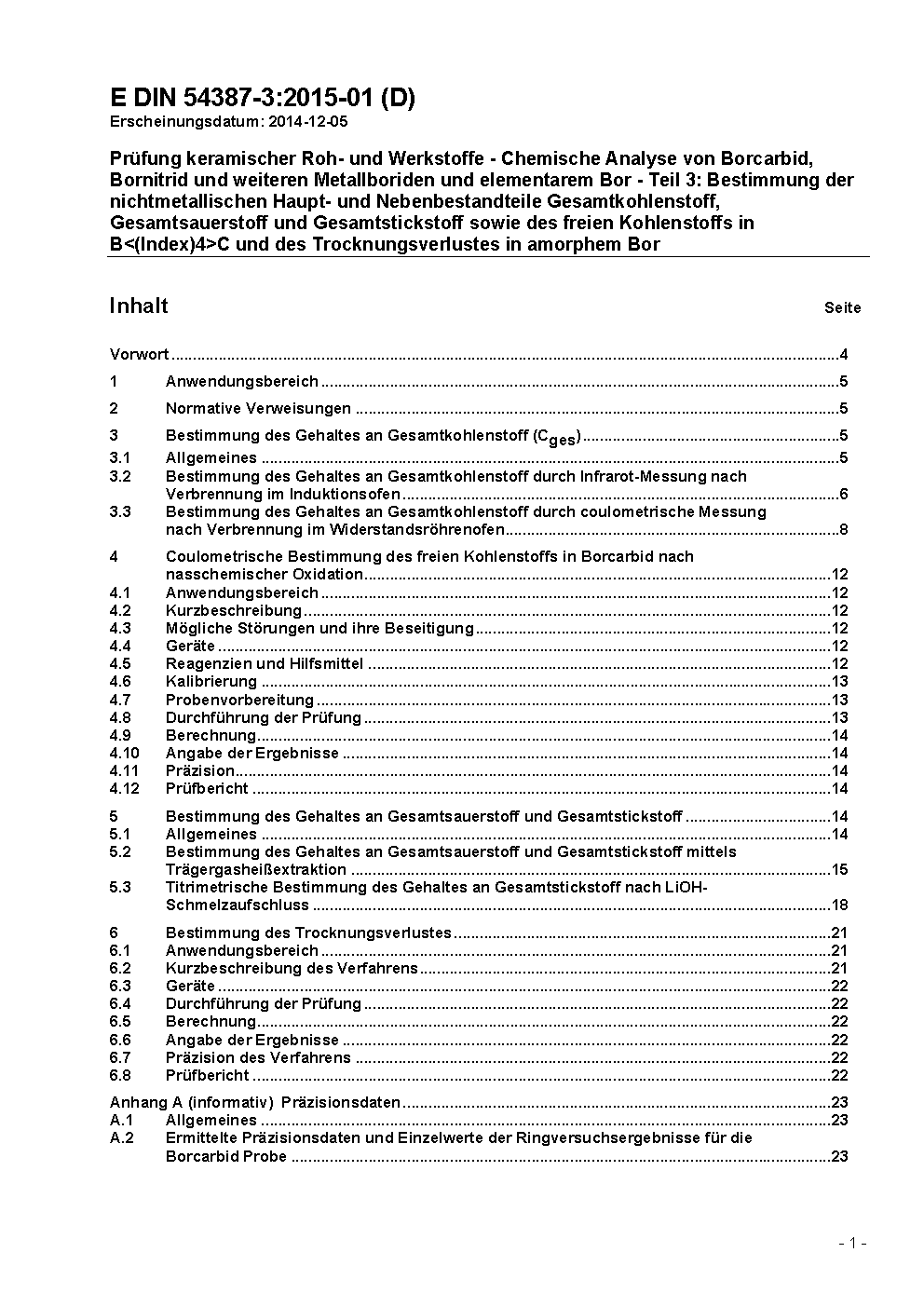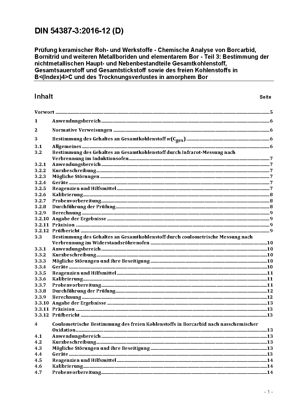 Prüfung keramischer Roh- und Werkstoffe - Chemische Analyse von Borcarbid, Bornitrid und weiteren Metallboriden und elementarem Bor - Teil 3: Bestimmung der nichtmetallischen Haupt- und Nebenbestandteile Gesamtkohlenstoff, Gesamtsauerstoff und Gesamtstickstoff sowie des freien Kohlenstoffs in B<(Index)4>C und des Trocknungsverlustes in amorphem Bor