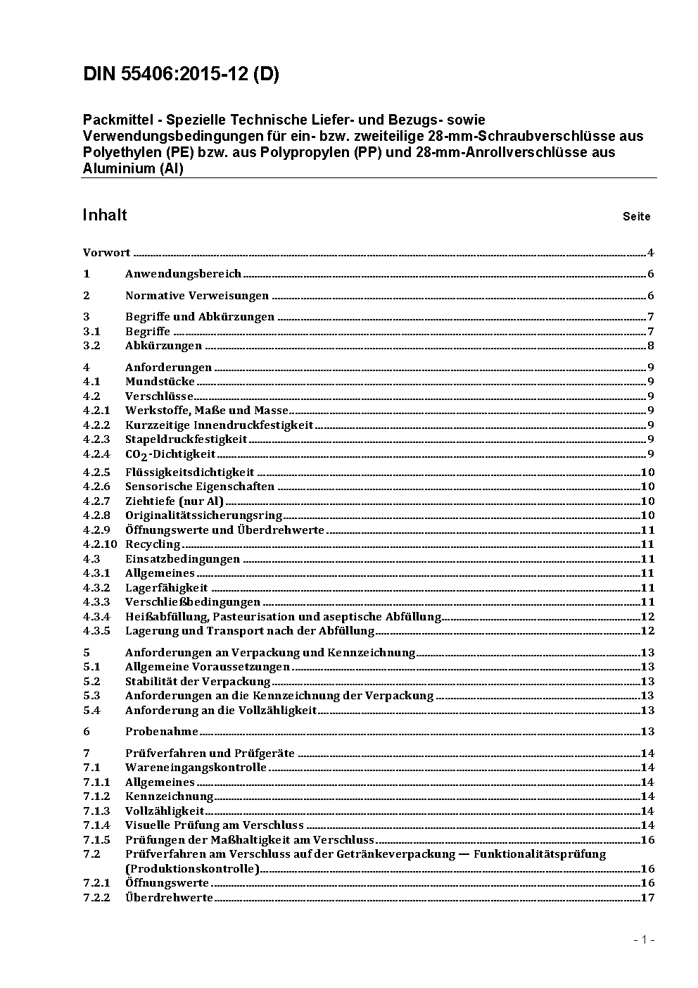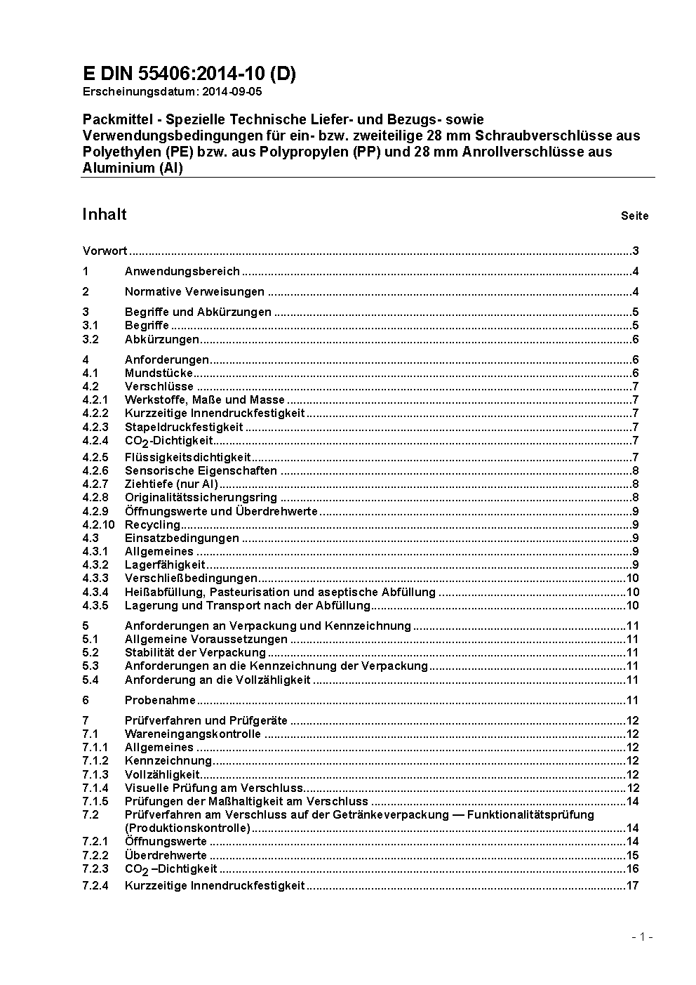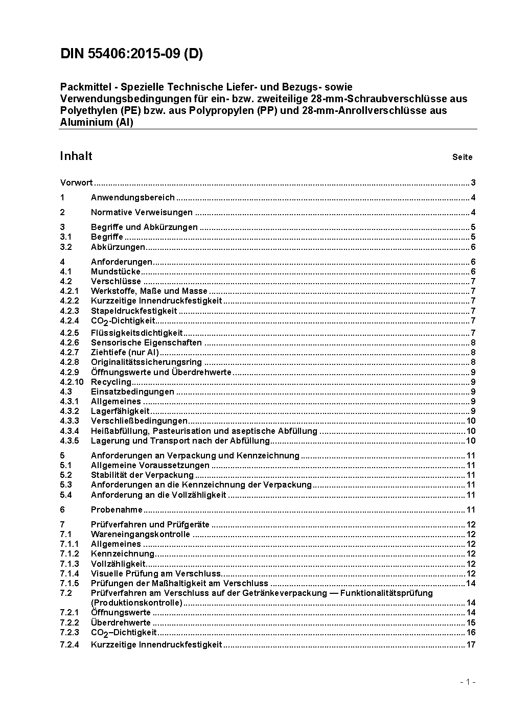 Packmittel - Spezielle Technische Liefer- und Bezugs- sowie Verwendungsbedingungen für ein- bzw. zweiteilige 28 mm Schraubverschlüsse aus Polyethylen (PE) bzw. aus Polypropylen (PP) und 28 mm Anrollverschlüsse aus Aluminium (Al)
