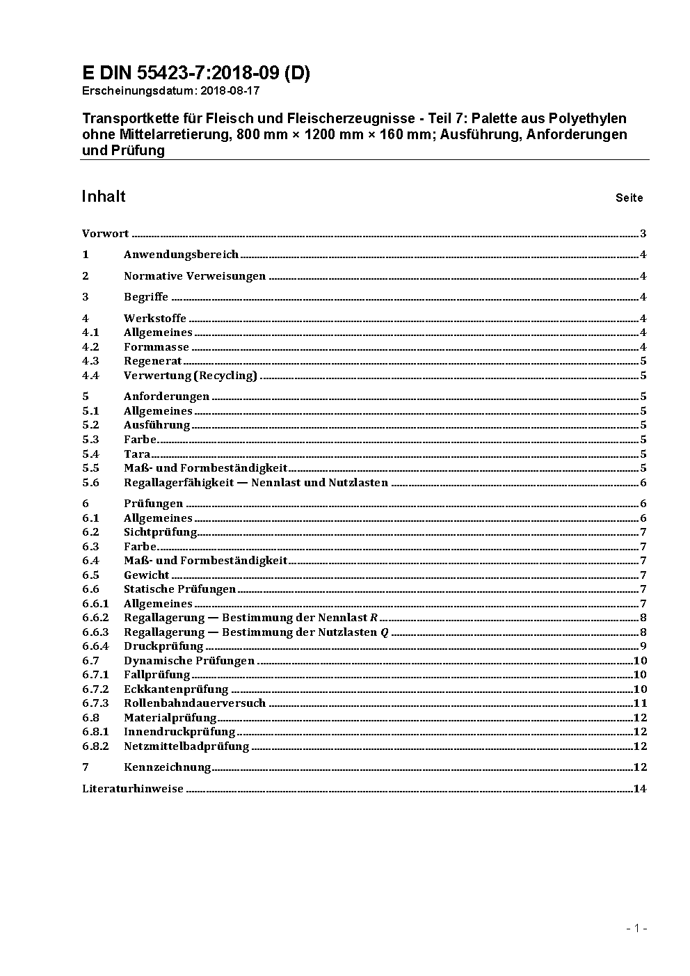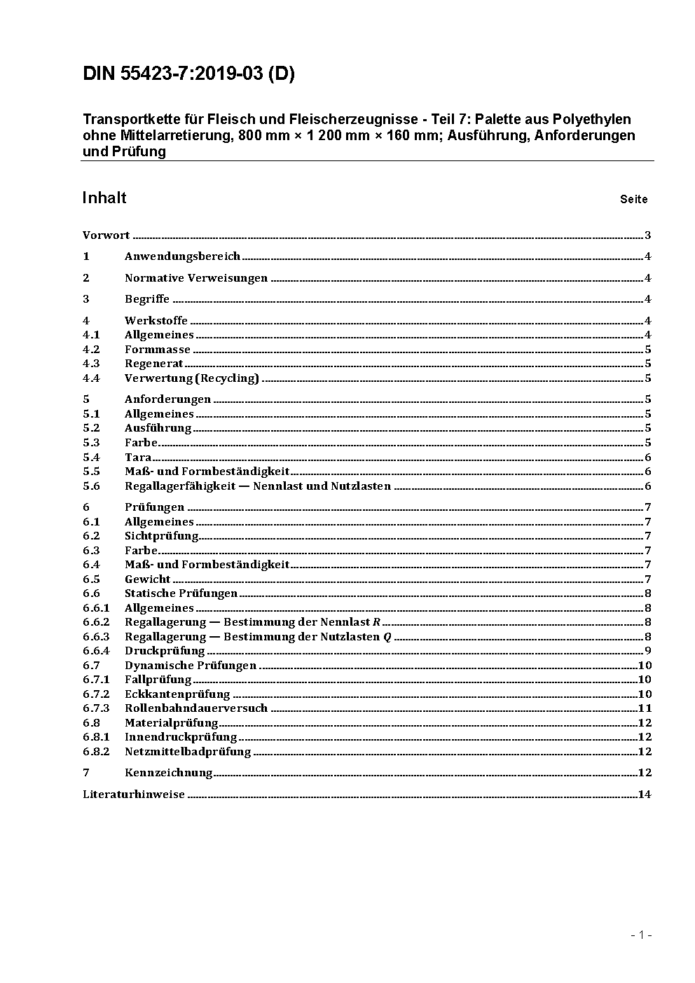 Transportkette für Fleisch und Fleischerzeugnisse - Teil 7: Palette aus Polyethylen ohne Mittelarretierung, 800 mm × 1 200 mm × 160 mm; Ausführung, Anforderungen und Prüfung