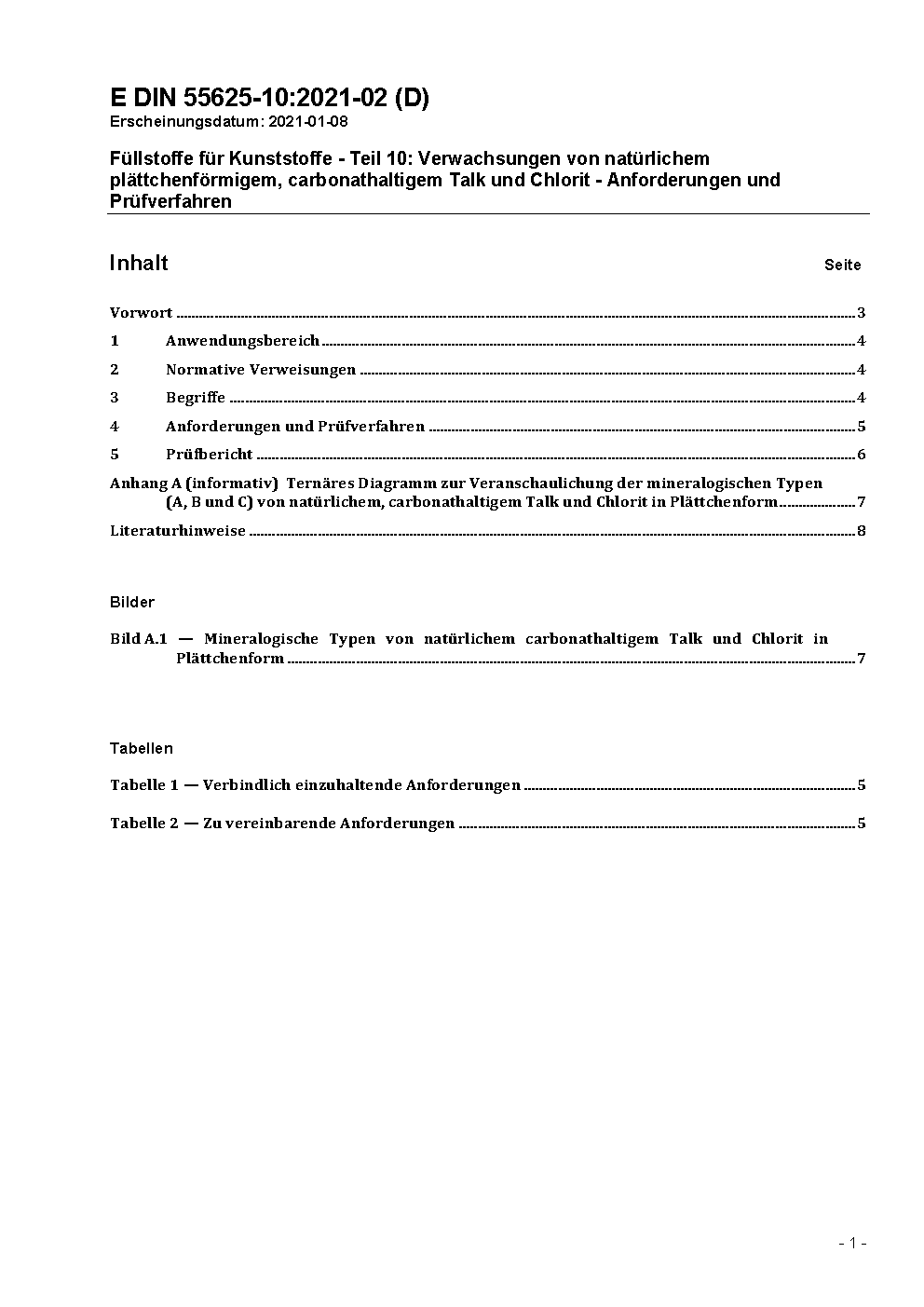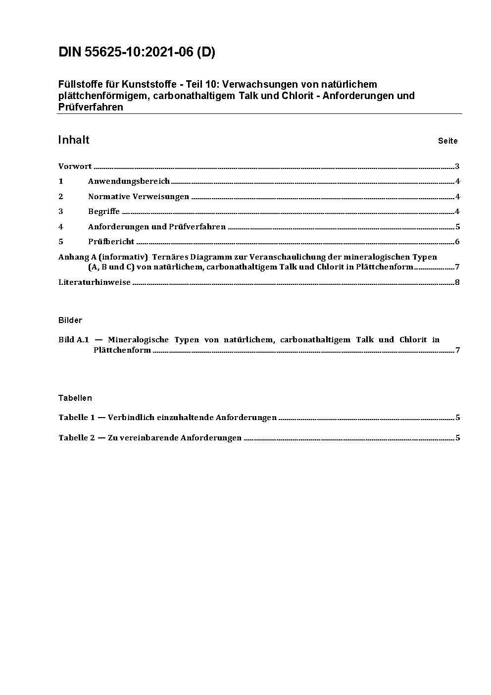 Füllstoffe für Kunststoffe - Teil 10: Verwachsungen von natürlichem plättchenförmigem, carbonathaltigem Talk und Chlorit - Anforderungen und Prüfverfahren