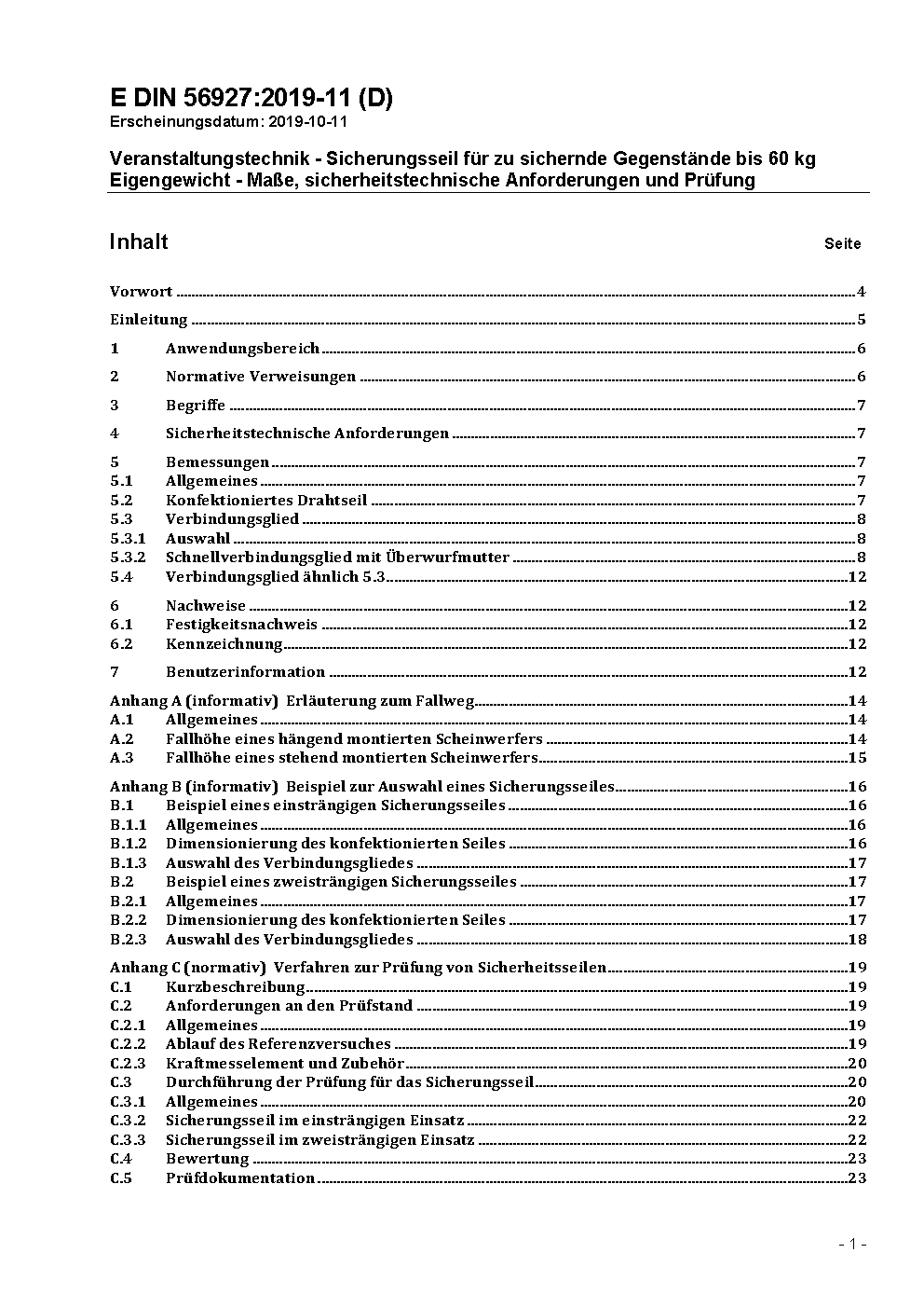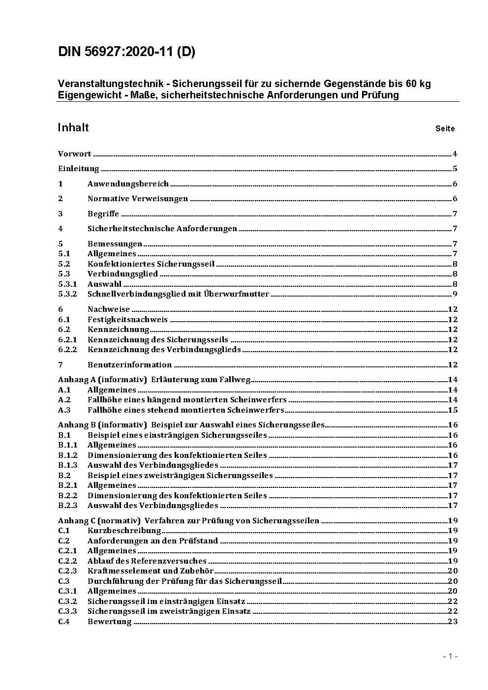 Veranstaltungstechnik - Sicherungsseil für zu sichernde Gegenstände bis 60 kg Eigengewicht - Maße, sicherheitstechnische Anforderungen und Prüfung / Achtung: Übergangsfrist, festgelegt durch DIN 56927 (2020-11), bis 2021-05-01 beachten.