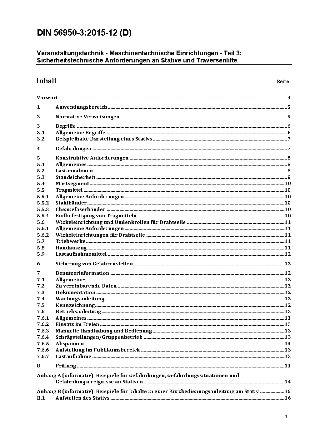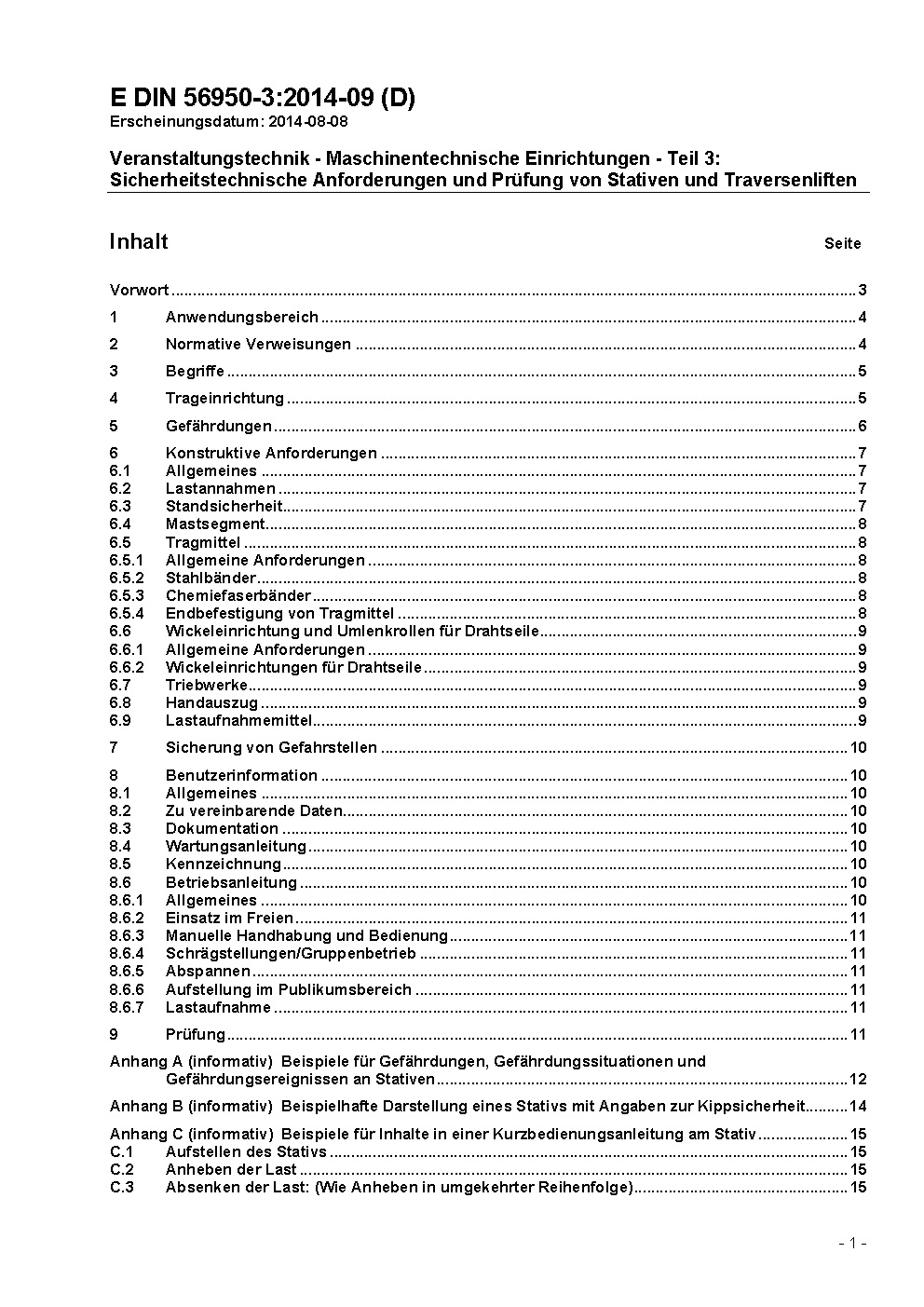 Veranstaltungstechnik - Maschinentechnische Einrichtungen - Teil 3: Sicherheitstechnische Anforderungen und Prüfung von Stativen und Traversenliften
