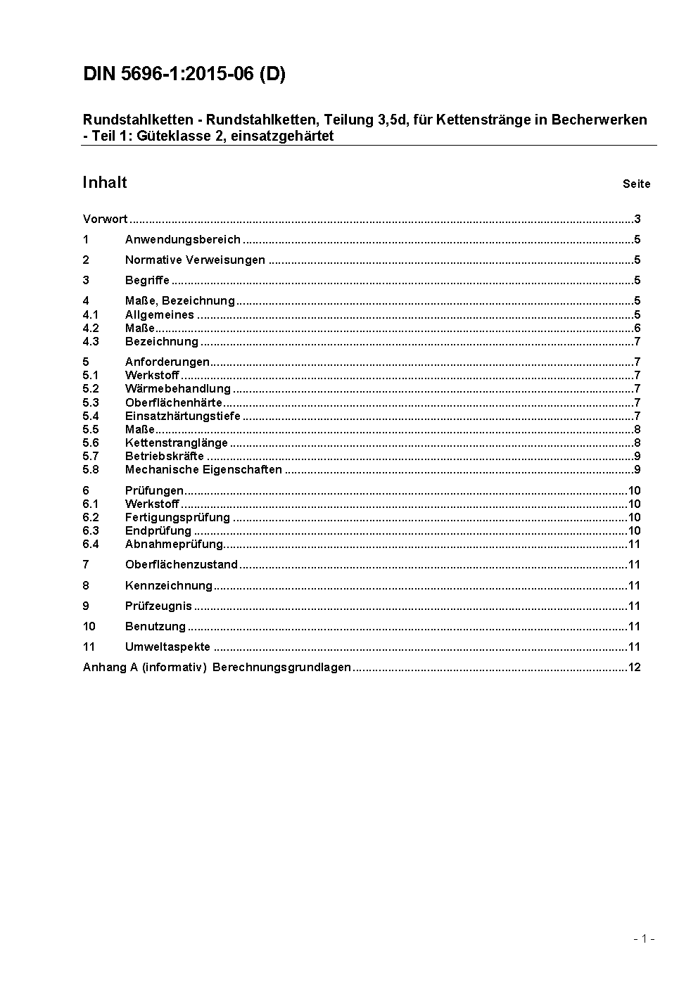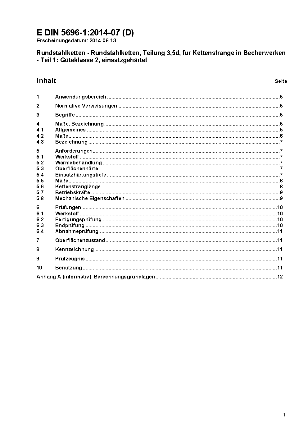Rundstahlketten - Rundstahlketten, Teilung 3,5d, für Kettenstränge in Becherwerken - Teil 1: Güteklasse 2, einsatzgehärtet / Achtung: Daneben gilt DIN 764-1 (1992-09) noch bis 2015-12-01.