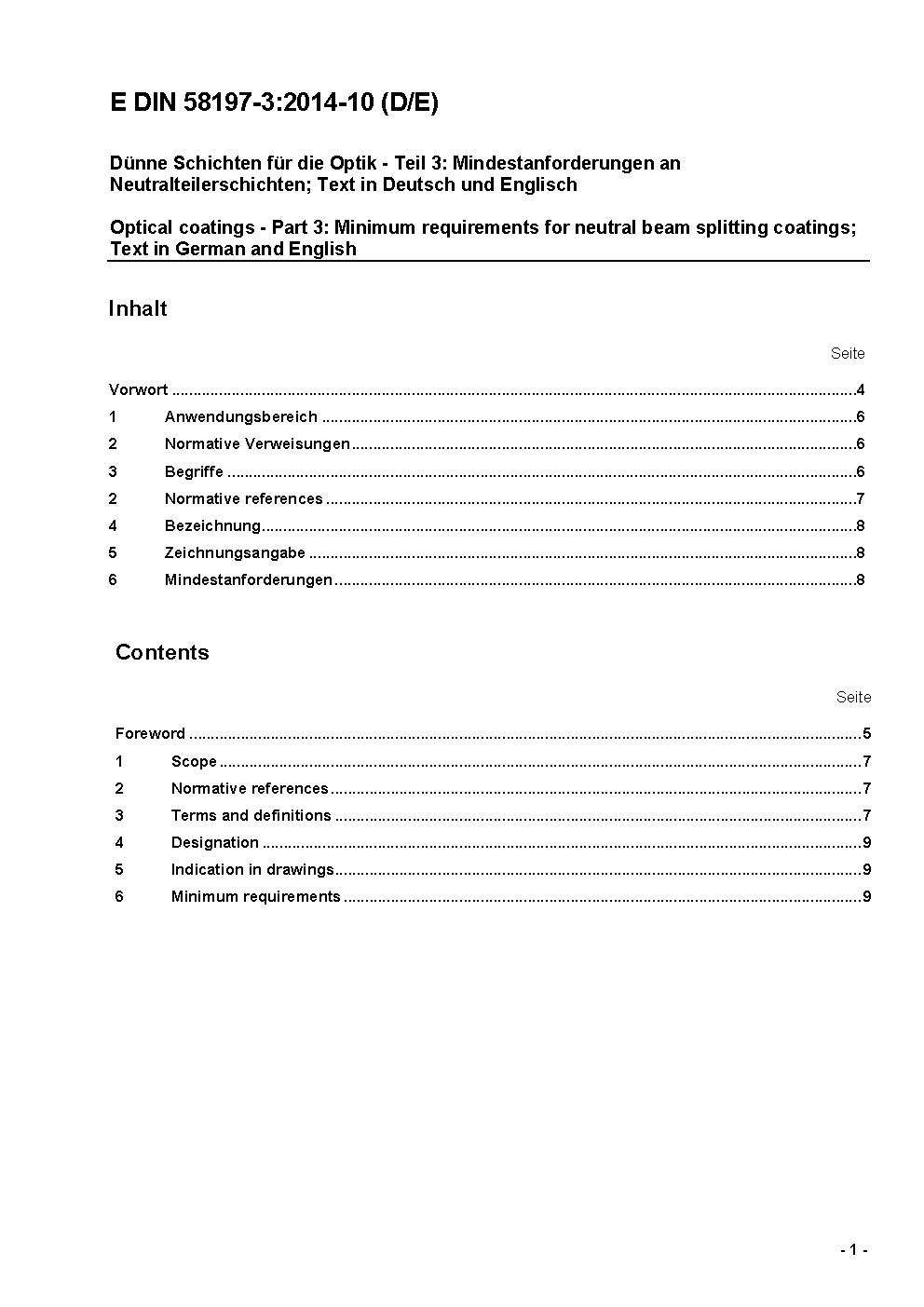 Optical coatings - Part 3: Minimum requirements for neutral beam splitting coatings; Text in German and English