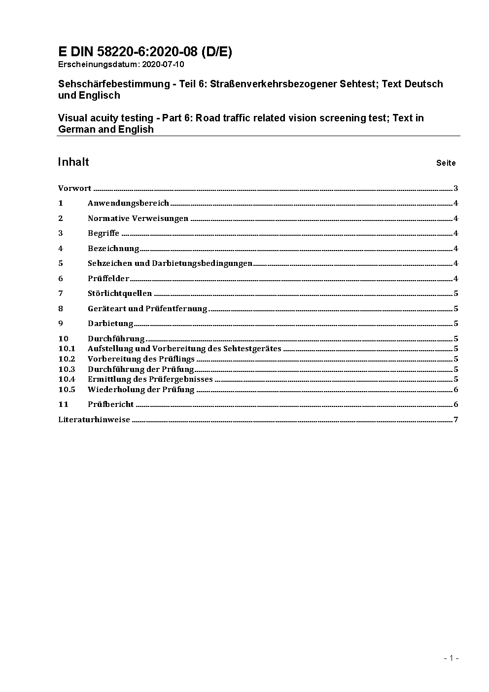 Sehschärfebestimmung - Teil 6: Straßenverkehrsbezogener Sehtest; Text Deutsch und Englisch