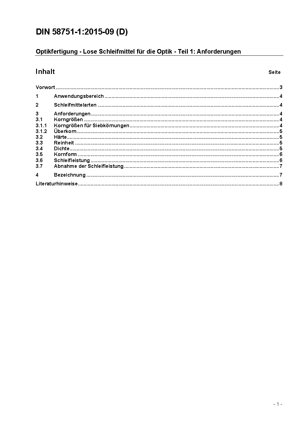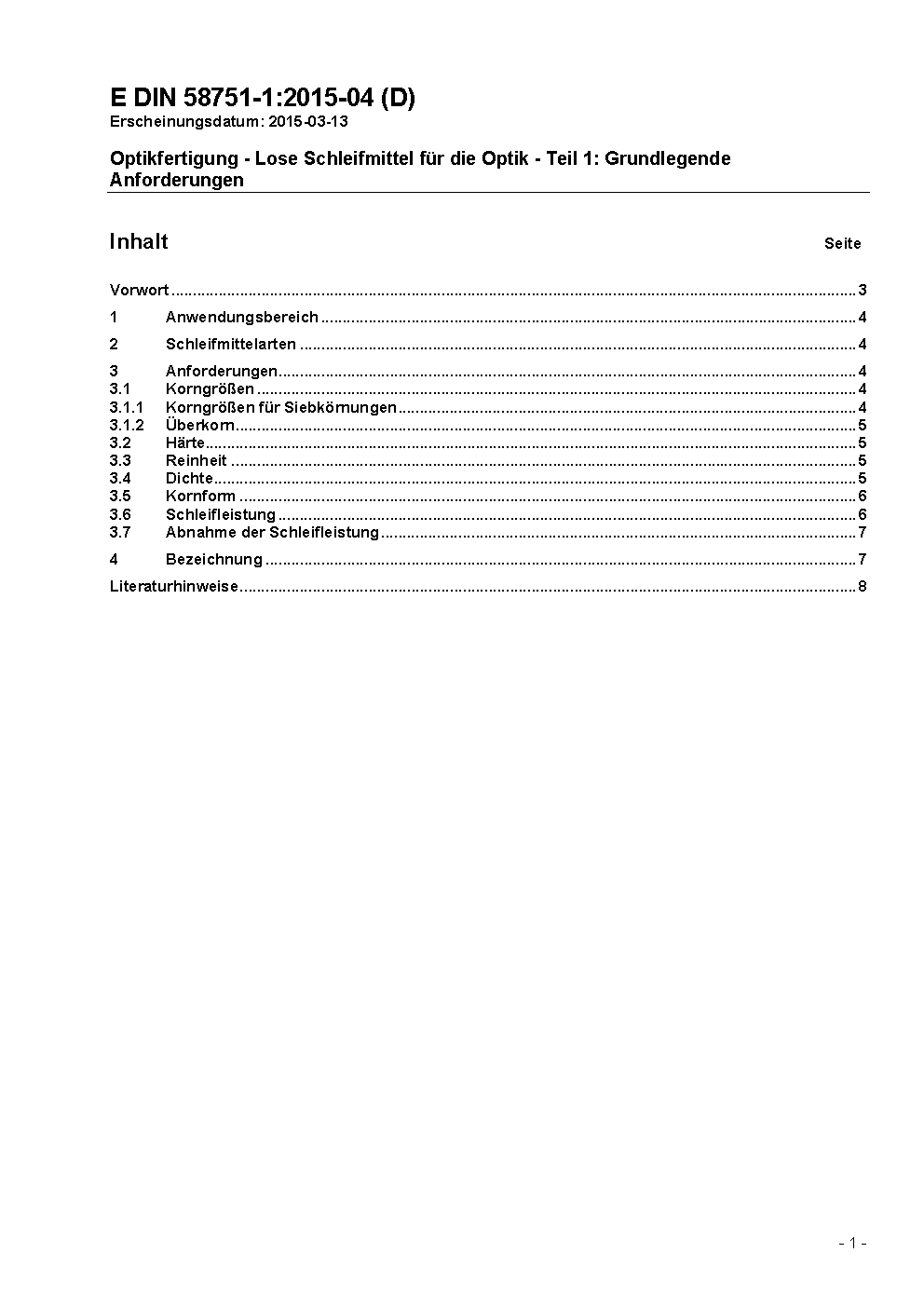 Optikfertigung - Lose Schleifmittel für die Optik - Teil 1: Grundlegende Anforderungen
