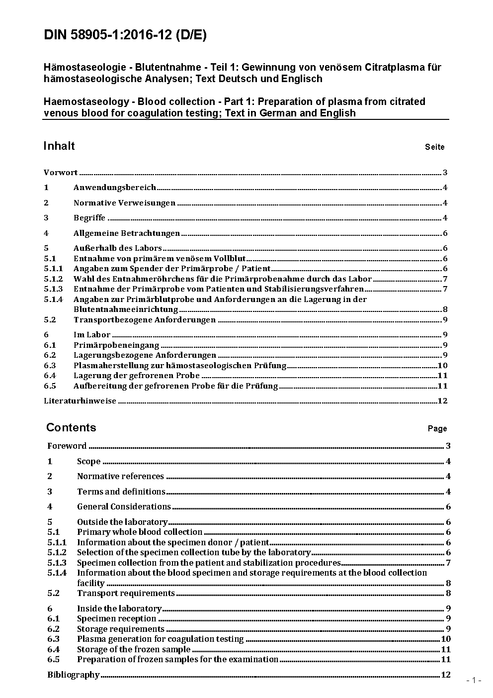 Haemostaseology - Blood collection - Part 1: Preparation of plasma from citrated venous blood for coagulation testing; Text in German and English