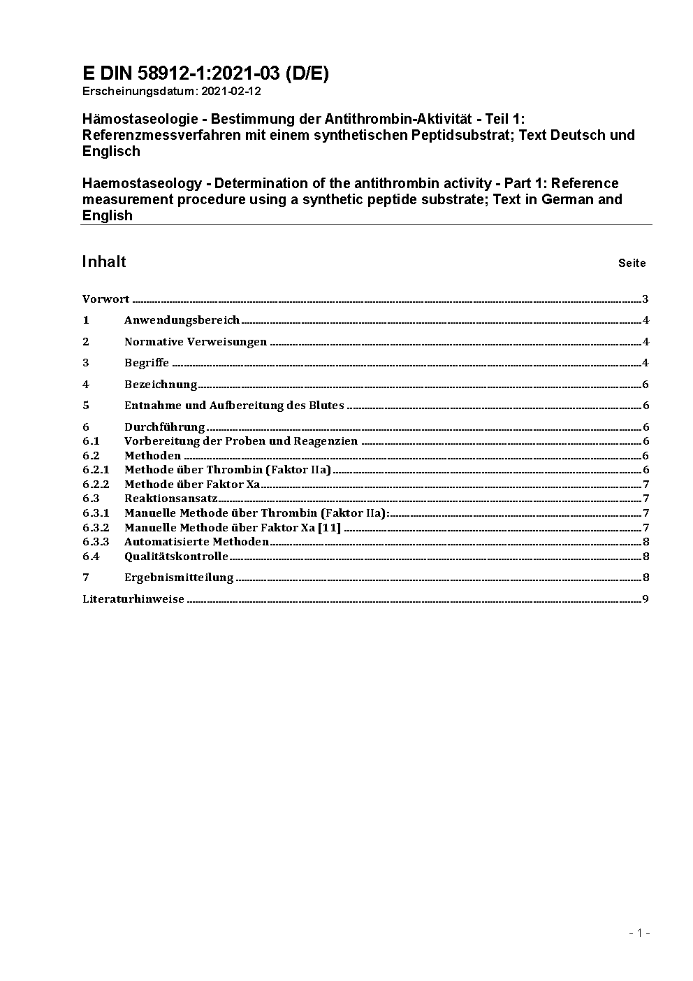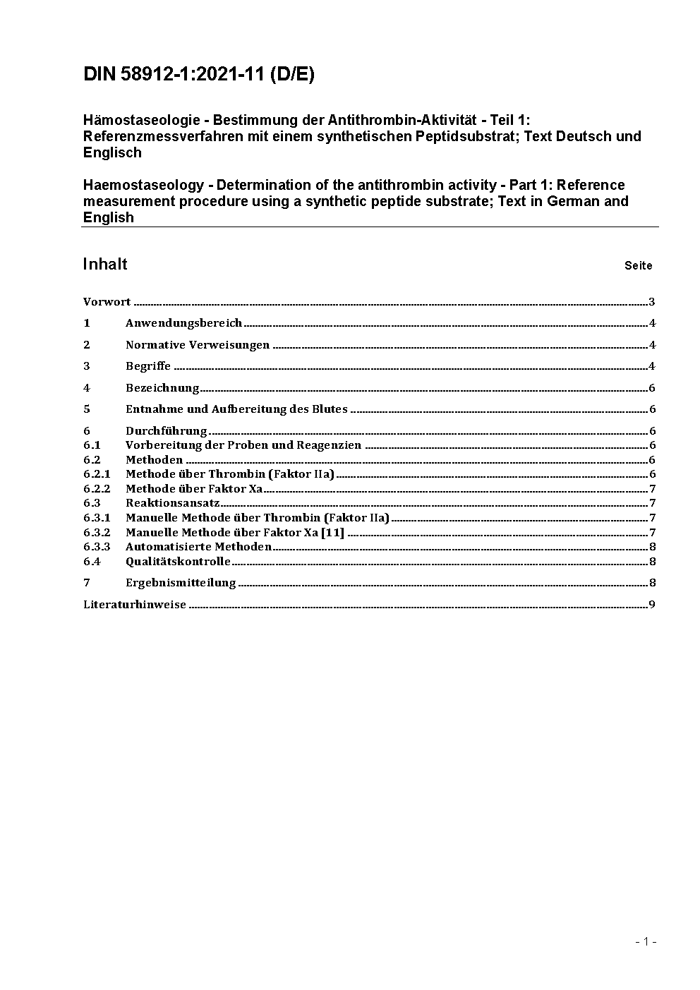 Hämostaseologie - Bestimmung der Antithrombin III-Aktivität - Teil 1: Referenzmeßverfahren mit einem synthetischen Peptidsubstrat