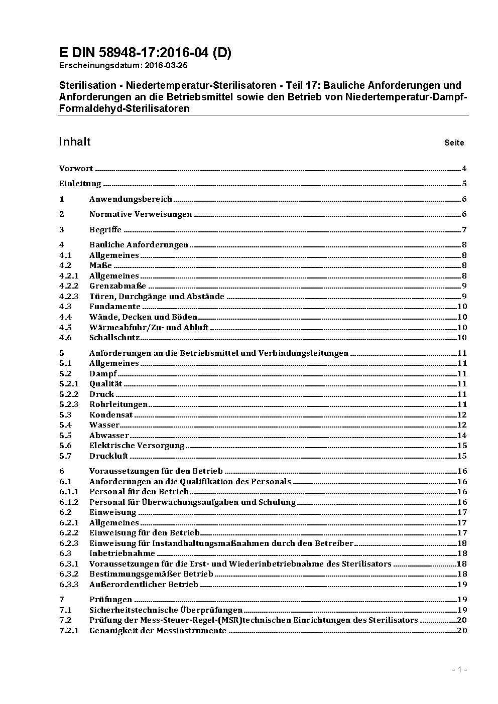 Sterilisation - Niedertemperatur-Sterilisatoren - Teil 17: Bauliche Anforderungen und Anforderungen an die Betriebsmittel sowie den Betrieb von Niedertemperatur-Dampf-Formaldehyd-Sterilisatoren