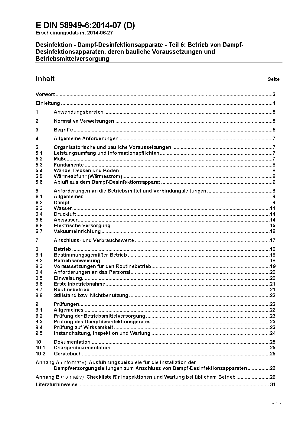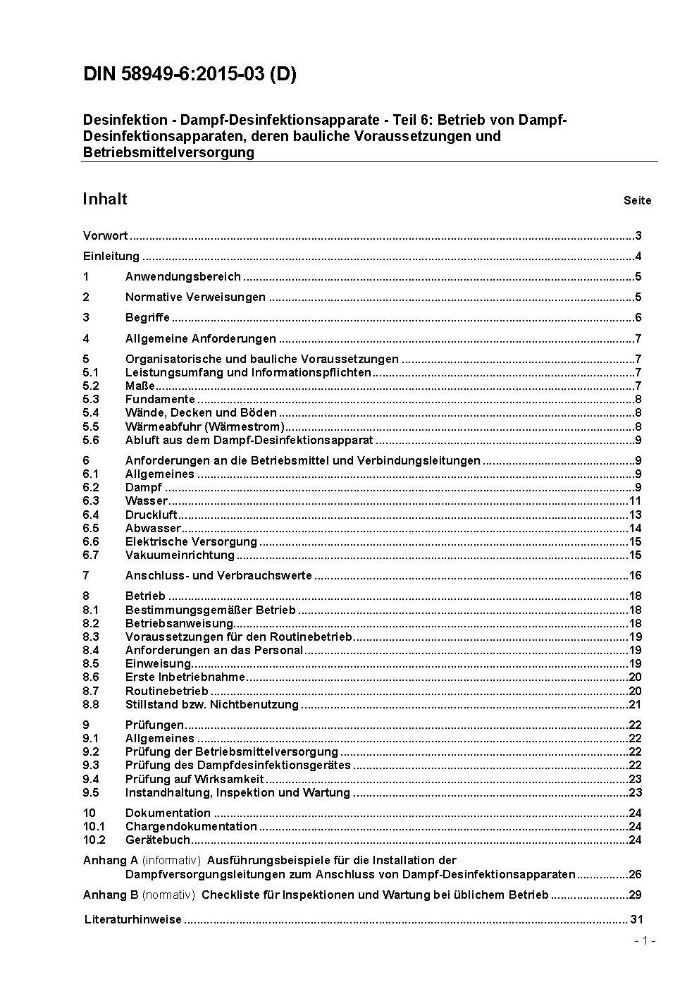 Desinfektion - Dampf-Desinfektionsapparate - Teil 6: Betrieb von Dampf-Desinfektionsapparaten, deren bauliche Voraussetzungen und Betriebsmittelversorgung