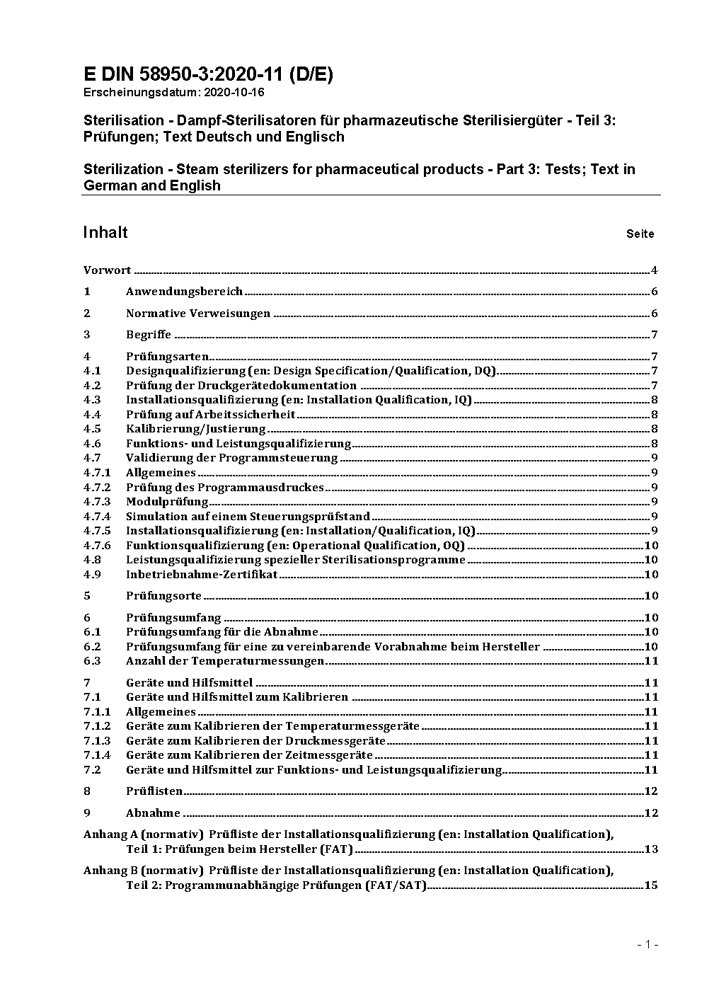 Sterilisation - Dampf-Sterilisatoren für pharmazeutische Sterilisiergüter - Teil 3: Prüfungen; Text Deutsch und Englisch / Achtung: Übergangsfrist, festgelegt durch DIN 58950-3 (2021-06), bis 2022-06-01 beachten.