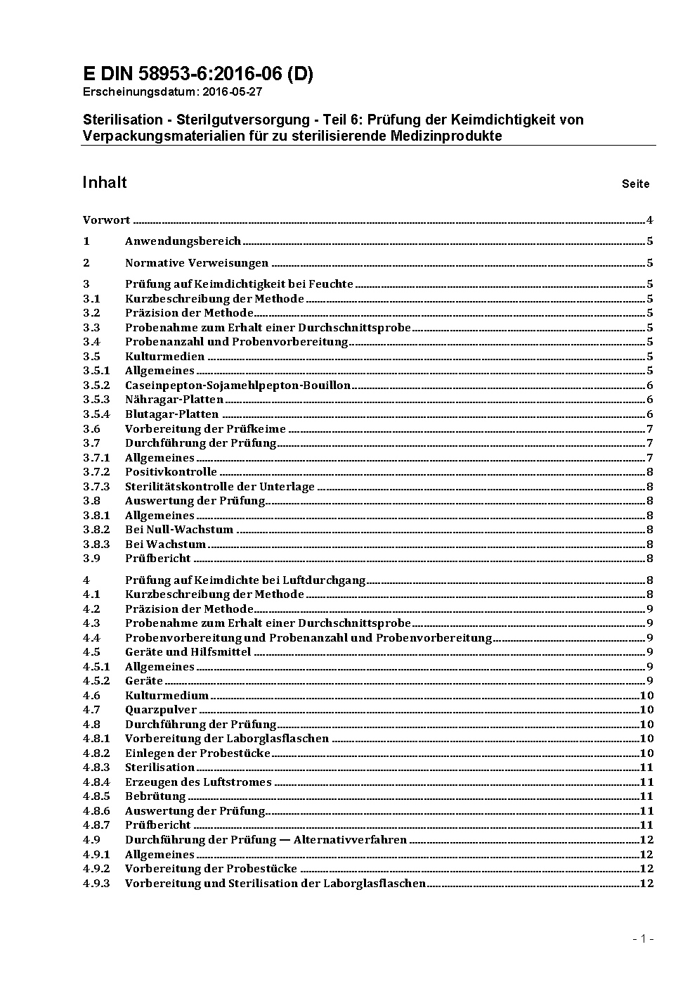 Sterilisation - Sterilgutversorgung - Teil 6: Prüfung der Keimdichtigkeit von Verpackungsmaterialien für zu sterilisierende Medizinprodukte