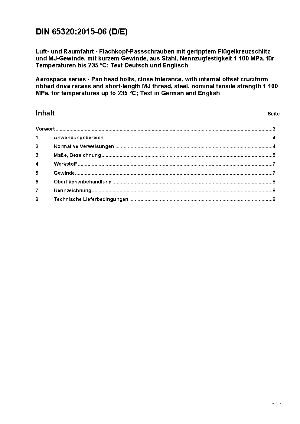 Luft- und Raumfahrt - Flachkopf-Passschrauben mit geripptem Flügelkreuzschlitz und MJ-Gewinde, mit kurzem Gewinde, aus Stahl, Nennzugfestigkeit 1 100 MPa, für Temperaturen bis 235 °C; Text Deutsch und Englisch