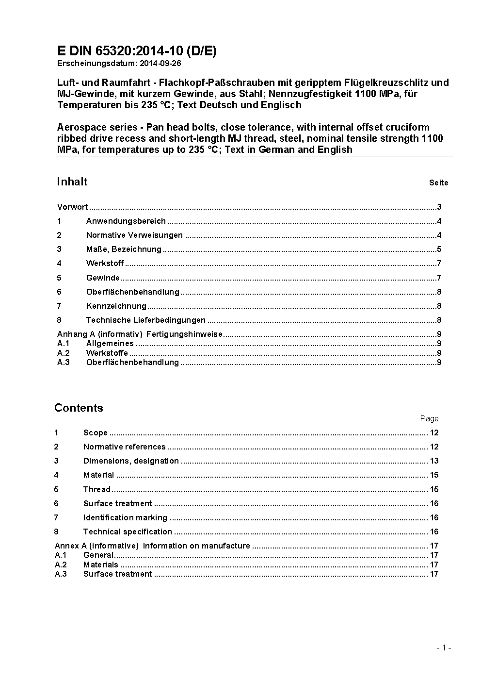 Aerospace series - Pan head bolts, close tolerance, with internal offset cruciform ribbed drive recess and short-length MJ thread, steel, nominal tensile strength 1 100 MPa, for temperatures up to 235 °C; Text in German and English