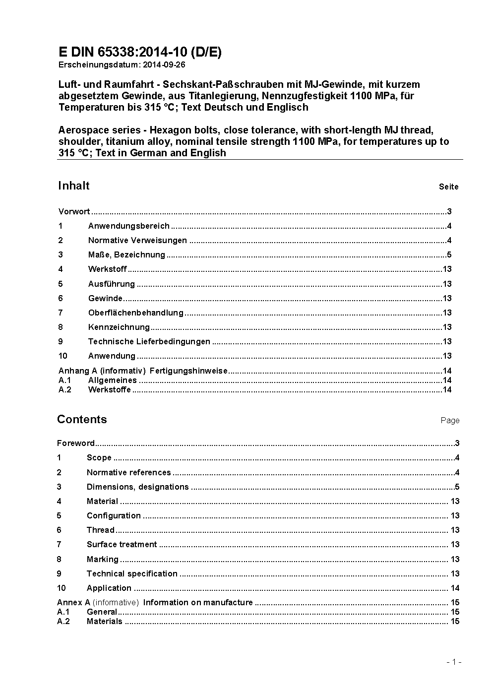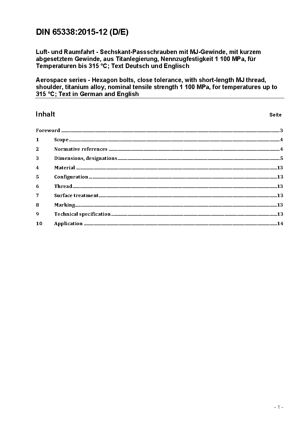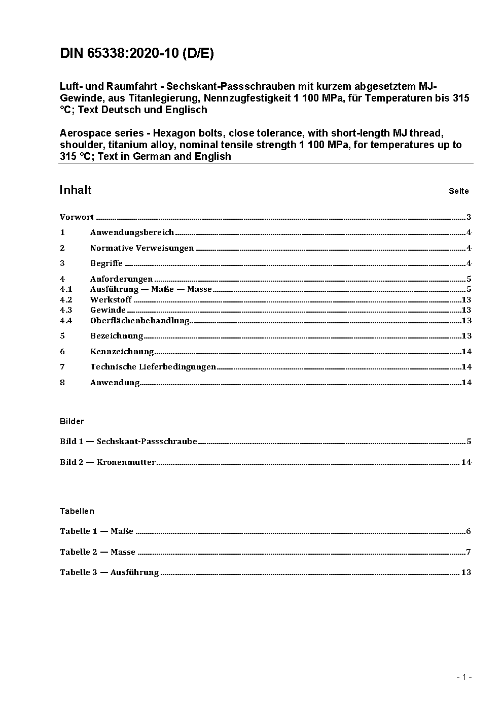 Luft- und Raumfahrt - Sechskant-Passschrauben mit MJ-Gewinde, mit kurzem abgesetztem Gewinde, aus Titanlegierung, Nennzugfestigkeit 1 100 MPa, für Temperaturen bis 315 °C; Text Deutsch und Englisch