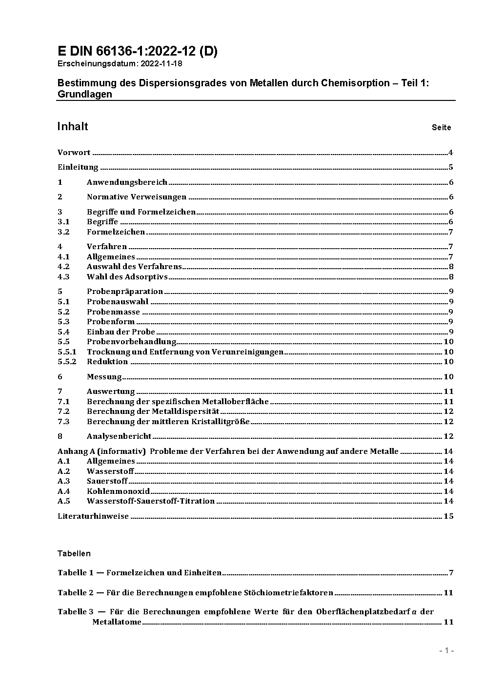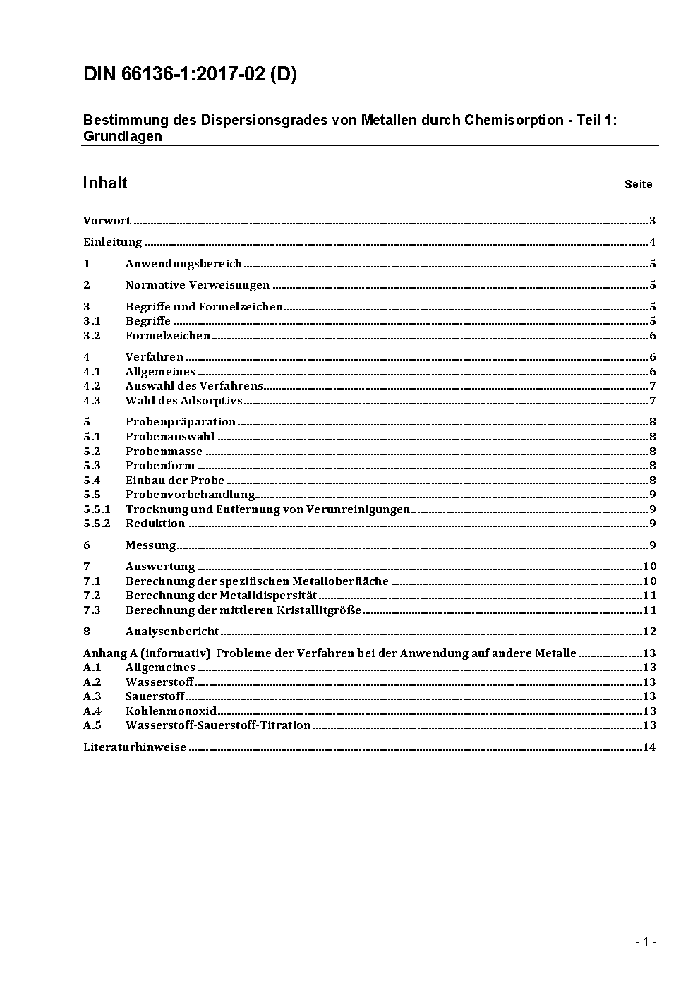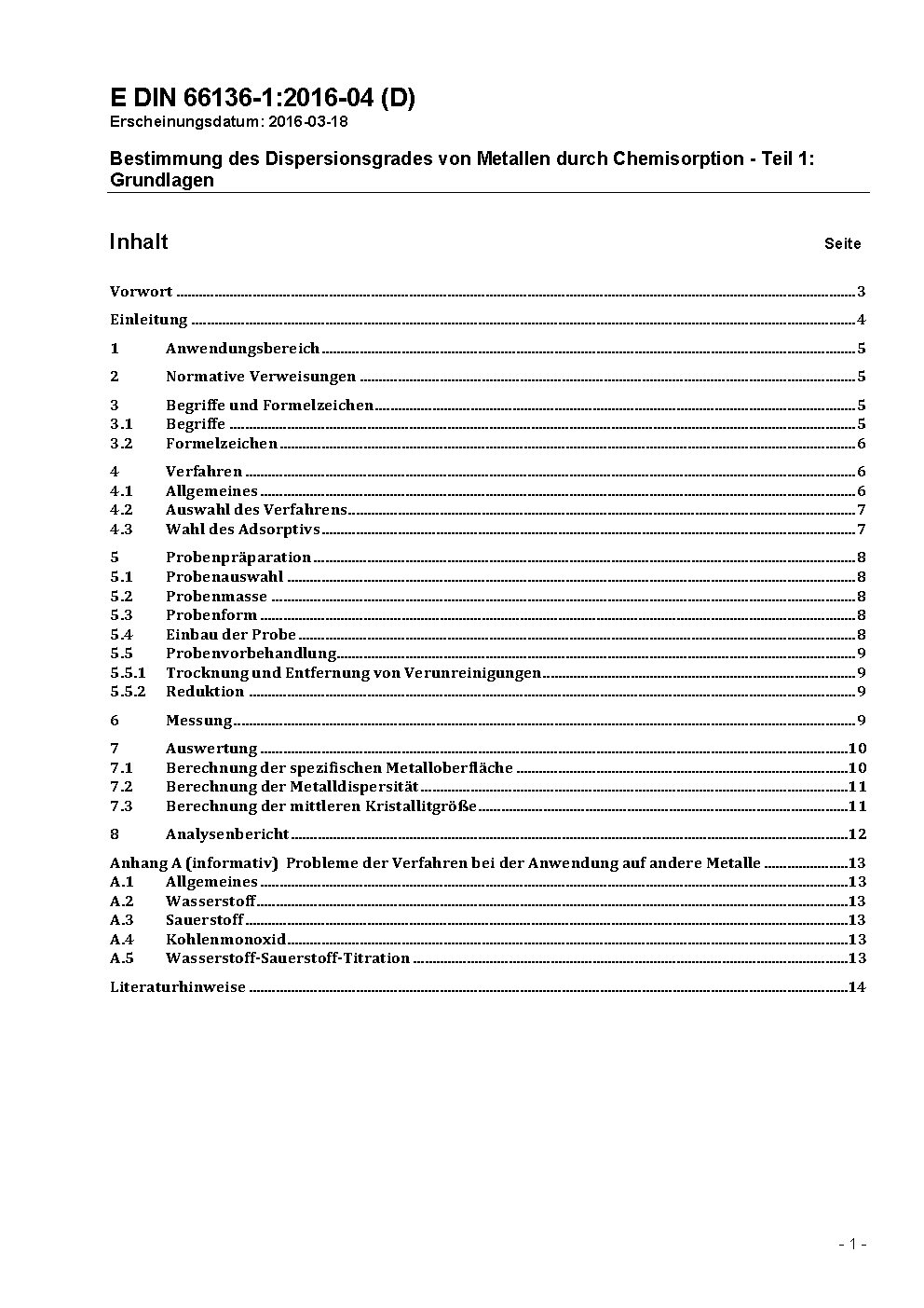 Bestimmung des Dispersionsgrades von Metallen durch Chemisorption - Teil 1: Grundlagen