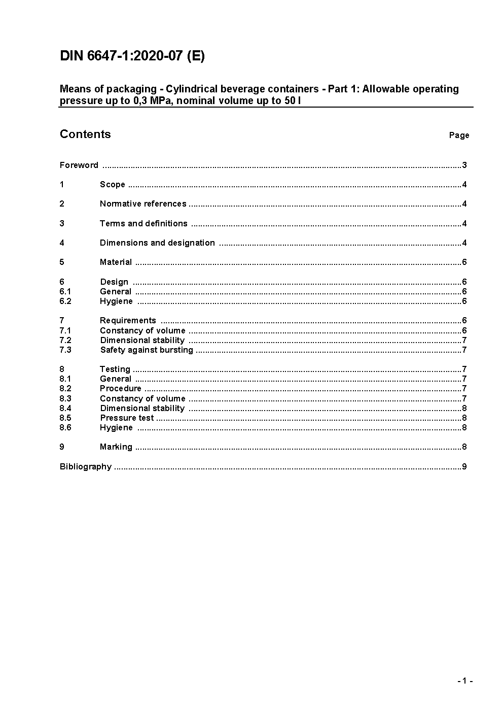 Packmittel - Zylindrische Getränke- und Grundstoffbehälter - Teil 1: Zulässiger Betriebsüberdruck bis 3 bar, Nennvolumen bis 50 Liter / Achtung: Übergangsfrist, festgelegt durch DIN 6647-1 (2020-07), bis 2020-12-31 beachten.